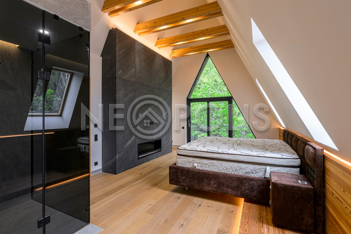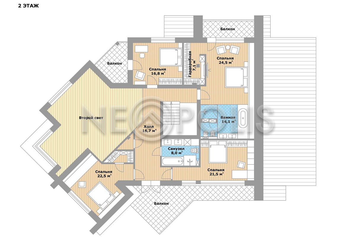 - 2 этаж:холл со вторым светом и выходом на балкон, мастер-спальня с гардеробной, ванной комнатой и балконом, спальня с гардеробной, спальня с балконом, спальня, санузел.