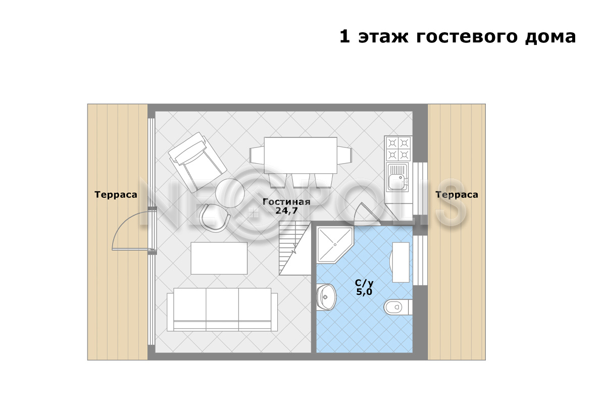1 этаж: гостиная с выходом на террасу, санузел.