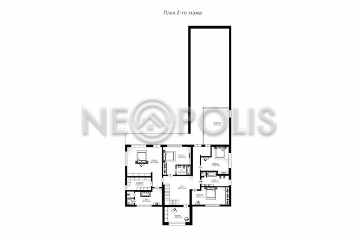 - 2 этаж:холл, мастер-спальня с гардеробной, ванной комнатой и выходом на террасу, спальня с ванной комнатой, две спальни, кабинет, тренажерный зал, санузел.