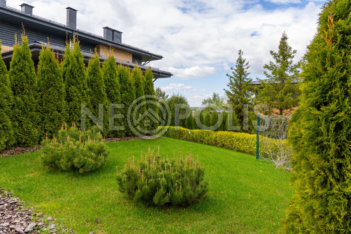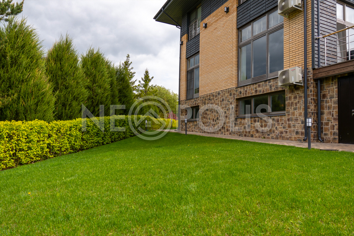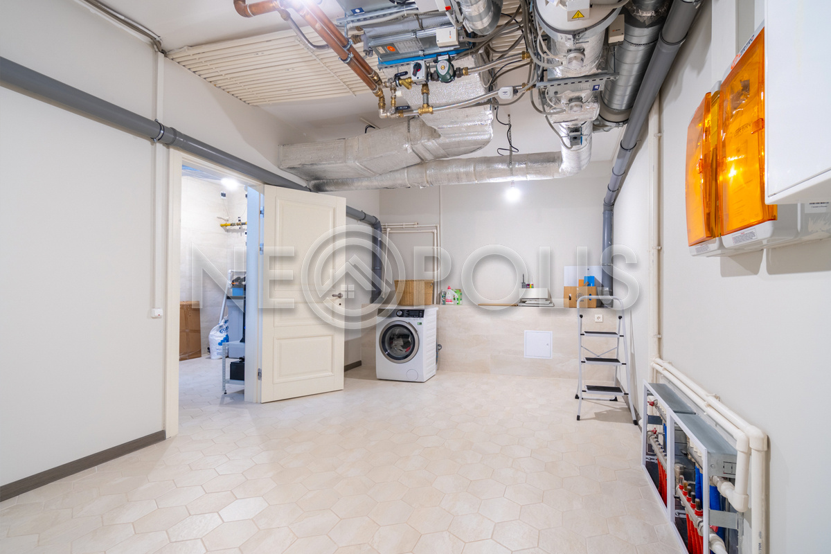 В цоколе дома (под домом с отдельным входом) - крытое утепленное подсобное помещение для хранения хозяйственного инвентаря, установлены накопительные баки для автоматической системы полива.