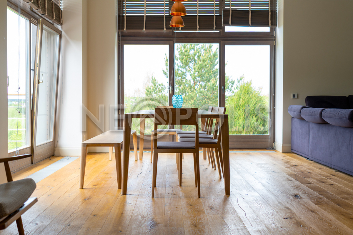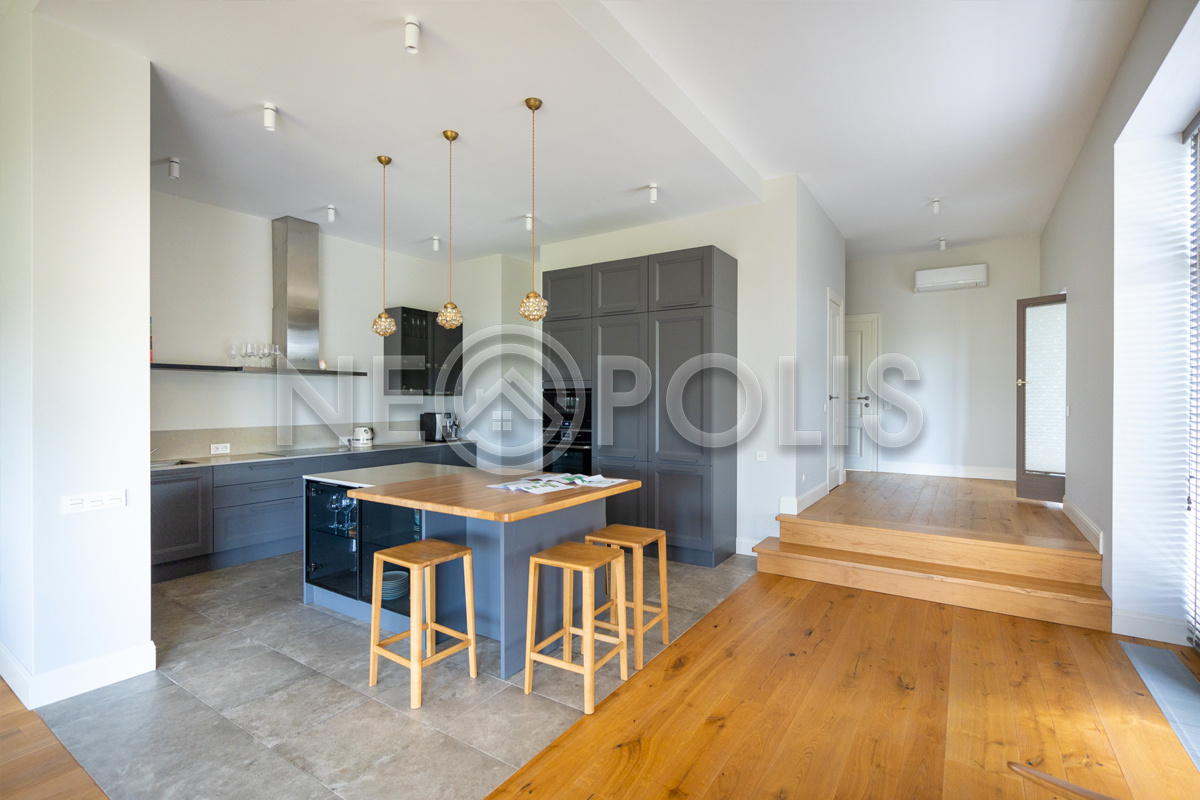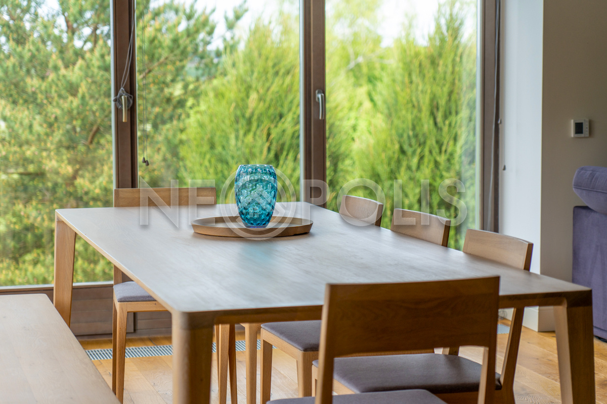 - Мебель: Javorina (Словакия). В кухне установлены: гарнитур с фасадами из массива дуба (ARAN, Италия) со столешницей из искусственного камня и встроенной бытовой техникой (KUPPERSBUSCH), холодильник двухстворчатый (Franke, Швецария), вытяжка (Elica, Италия)