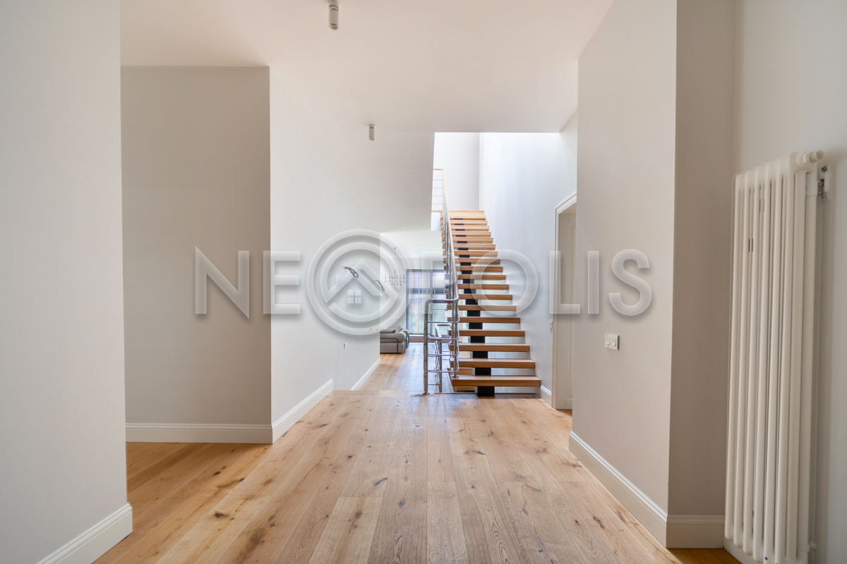 - Лестница: металлокаркас с ограждением из нержавеющей стали, дубовыми поручнями и ступенями