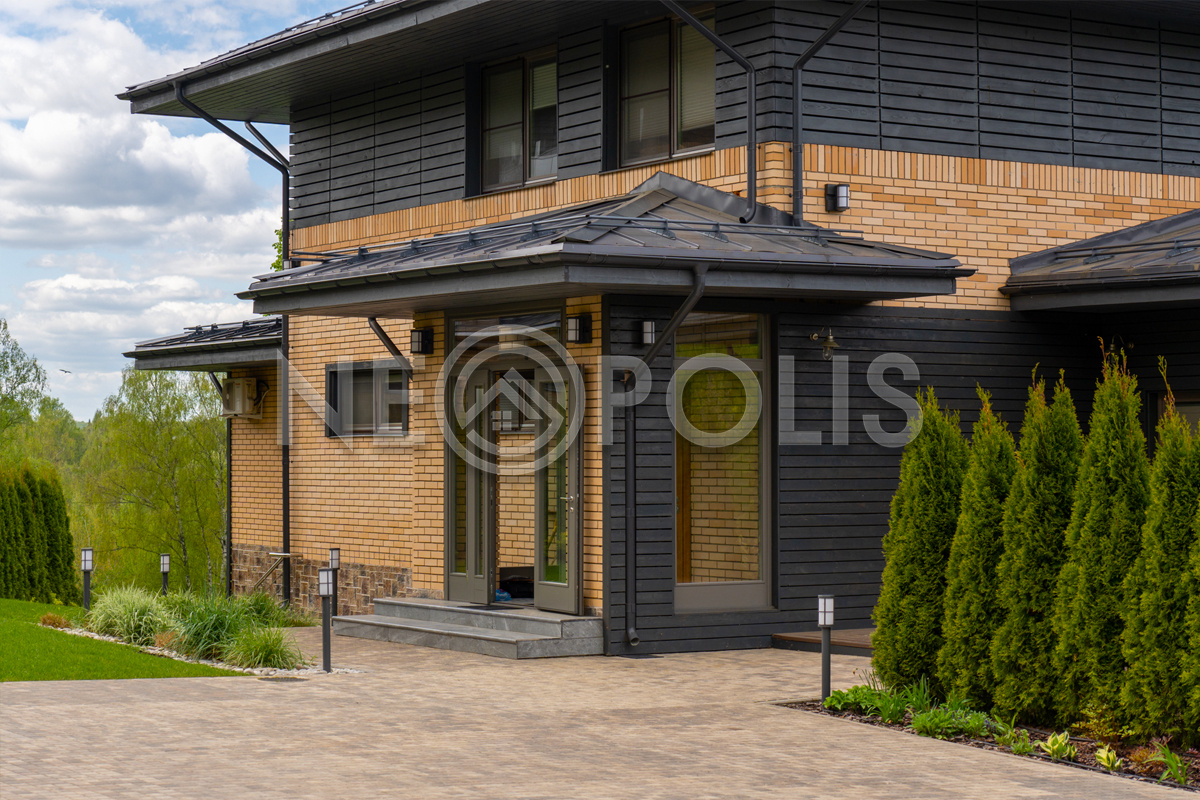 - Материал стен керамические блоки (поризованный кирпич Porotherm (510 мм), утеплитель; комбинированная отделка фасада - облицовочный кирпич, тонированная лиственница, цоколь облицован искусственным камнем