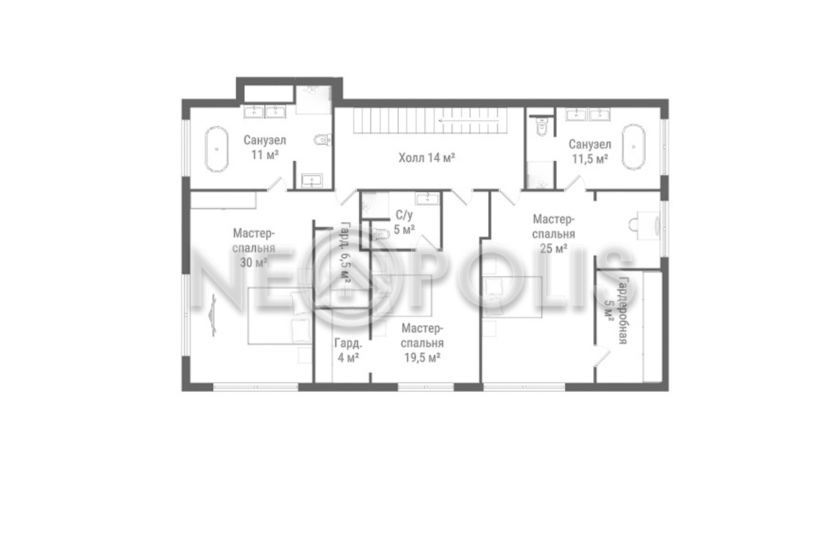 - 2 этаж:холл, мастер-спальня с гардеробной и ванной комнатой, две спальни с гардеробными и ванными комнатами.