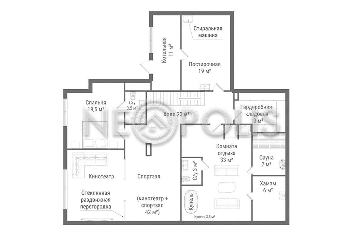 - Цоколь:лестничный холл, спальня с ванной комнатой, сезонная гардеробная, SPA зона: комната отдыха, сауна, хамам, купель, санузел; тренажерный зал, зона домашнего кинотеатра, постирочная, котельная с дополнительным входом с улицы.