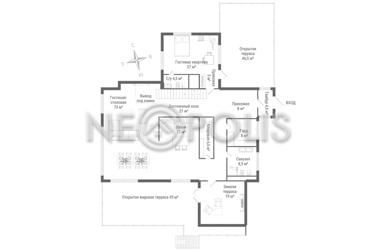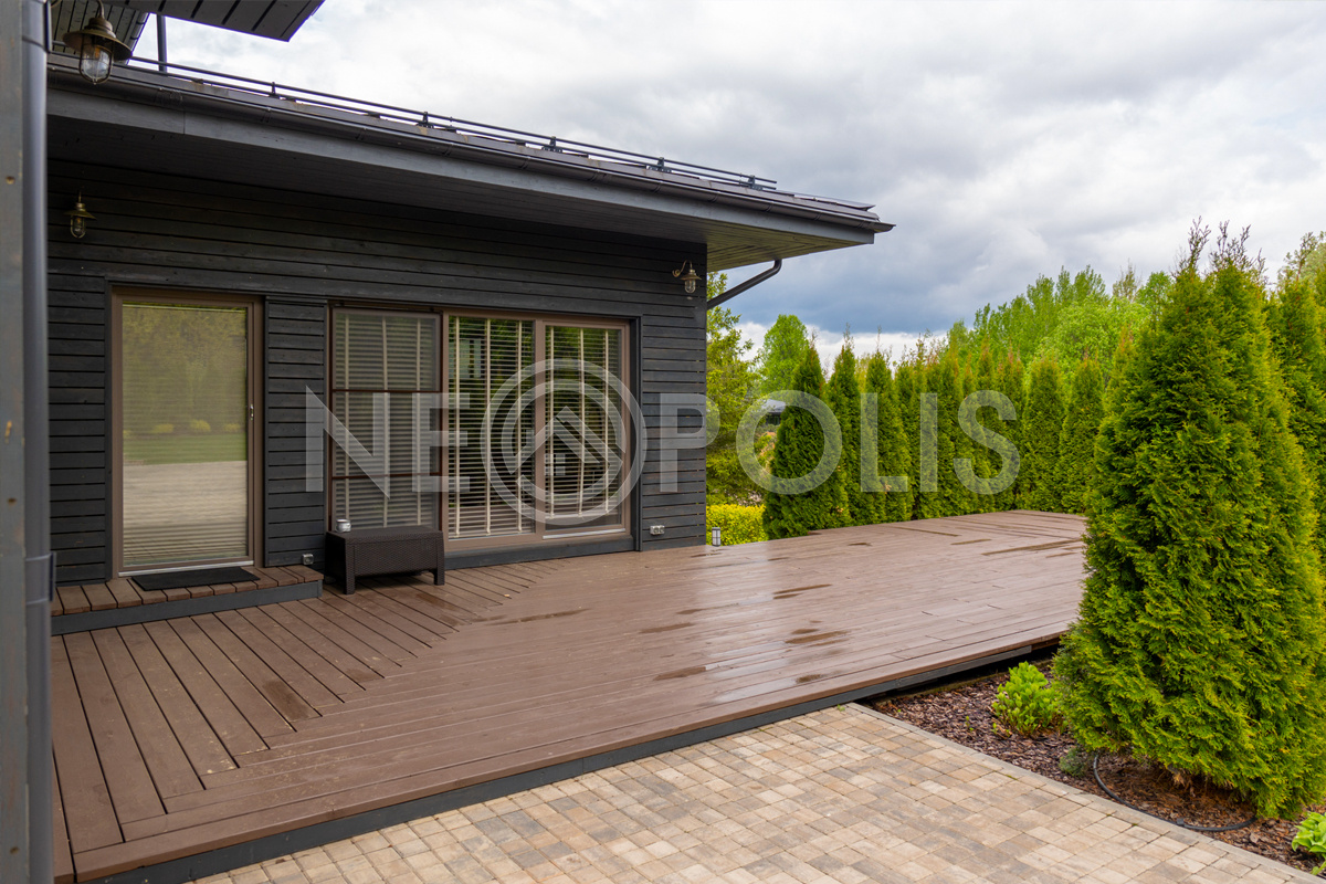 - 1 этаж:тамбур, прихожая, лестничный холл, кухня с кладовой и зимней террасой и выходом на отрытую террасу, столовая, гостиная, спальня с ванной комнатой и выходом на террасу, гардеробная, санузел.
