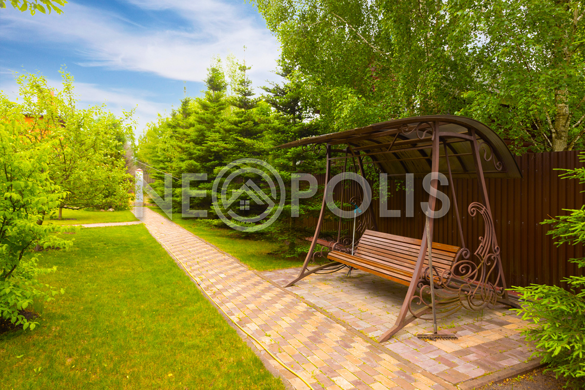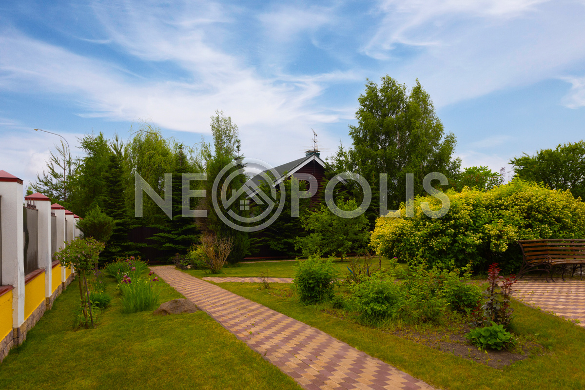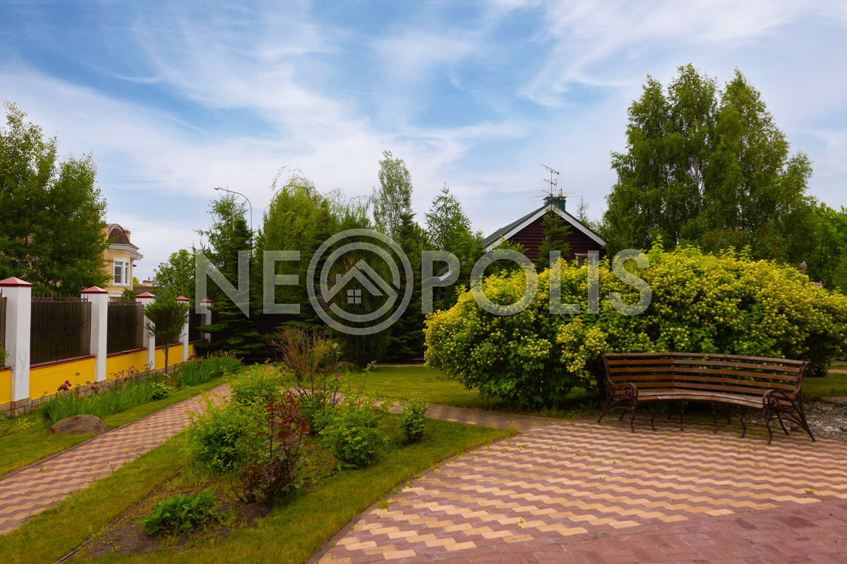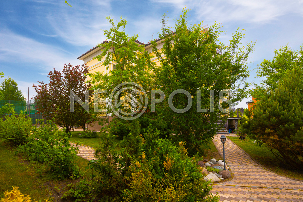 Просторный зеленый участок с парковым ландшафтным дизайном.
