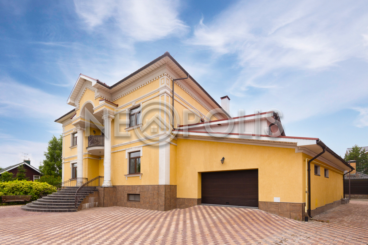 - 1 этаж:холл, кухня-столовая, гостиная с камином, вторым светом и выходом на террасу, спальня с гардеробной, 2 гардеробные, санузел, гараж на 2 авто с квартирой для персонала на 2 этаже.