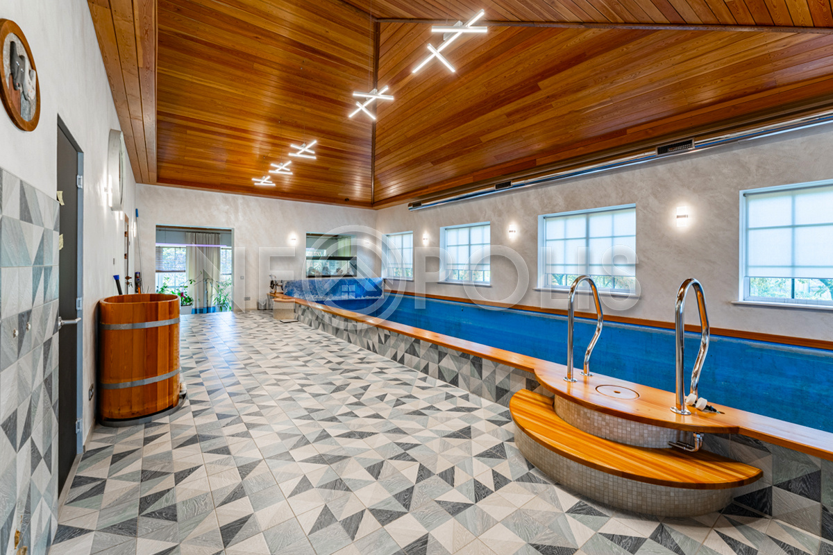 - 1 этаж:прихожая, кухня-столовая с камином с выходом в зимний сад и на веранду, гостиная, кабинет, гардеробная, санузел; SPA зона: комната отдыха, бассейн, хамам, санузел с душевой.