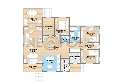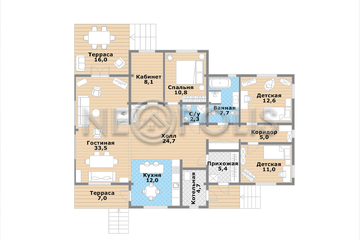 - 1 этаж:прихожая с зоной хранения, холл, кухня-столовая, гостиная с камином и выходами на террасы, три спальни, кабинет, два санузла, котельная с отдельным входом с улицы.