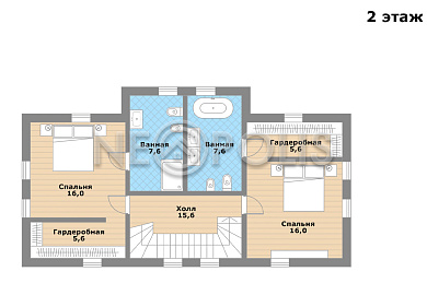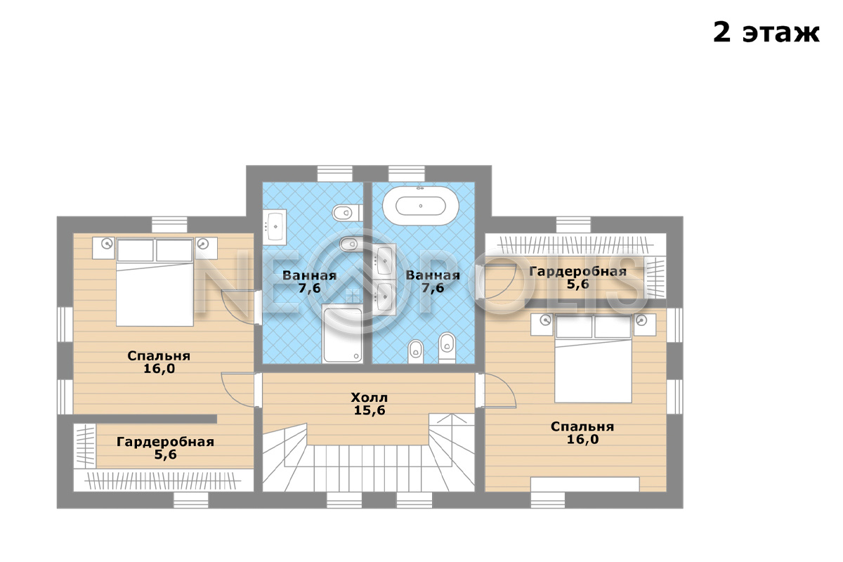 - 2 этаж:холл, две спальни с гардеробными и ванными комнатами.