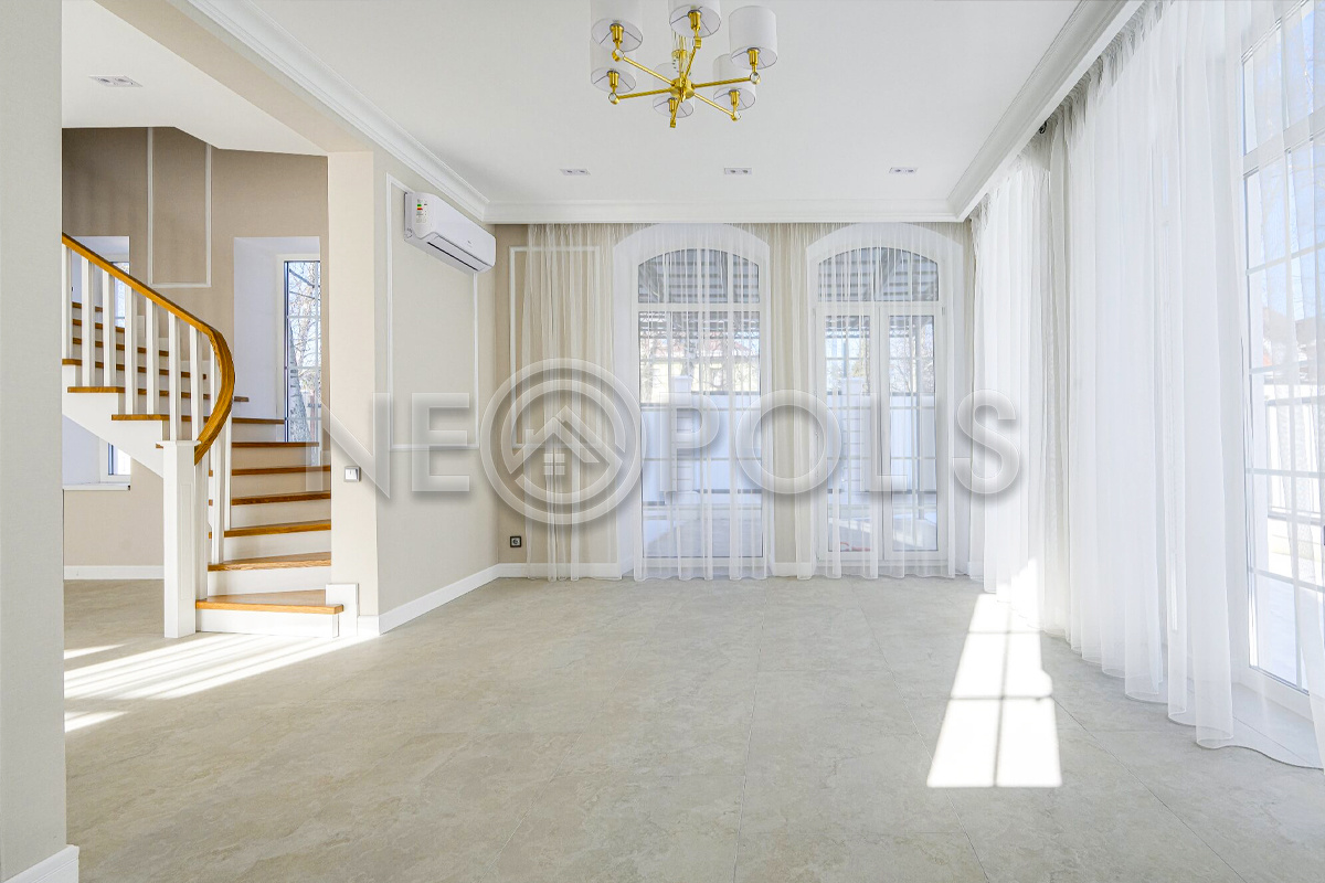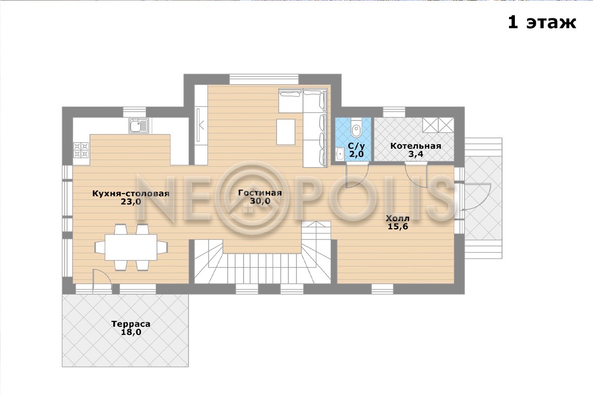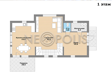 - 1 этаж:крыльцо, холл, кухня-столовая с выходом на террасу 18 кв.м., гостиная, санузел, котельная.