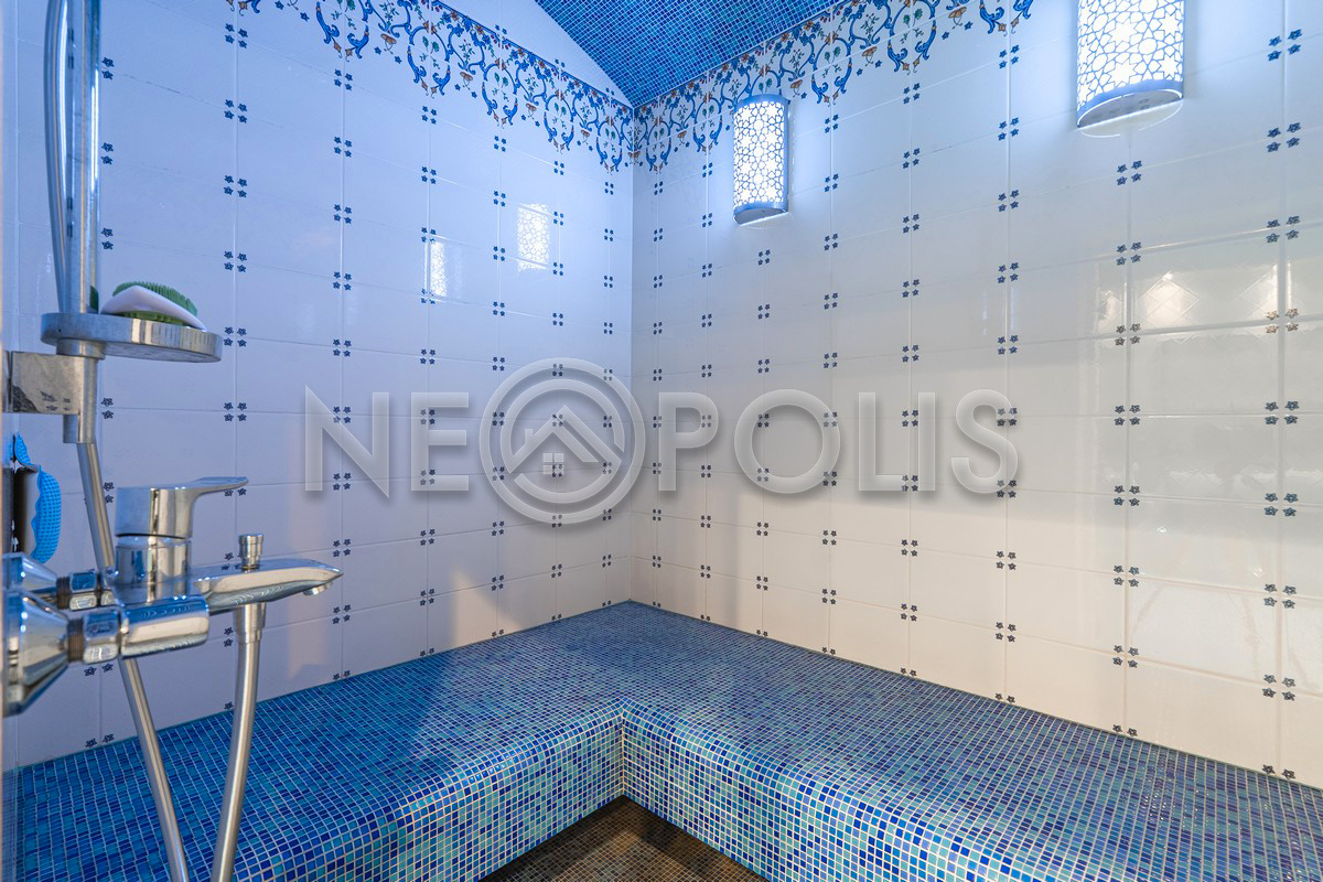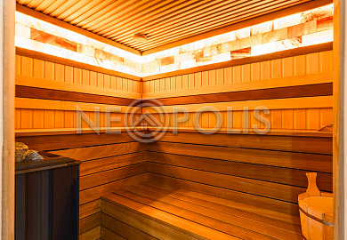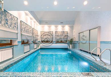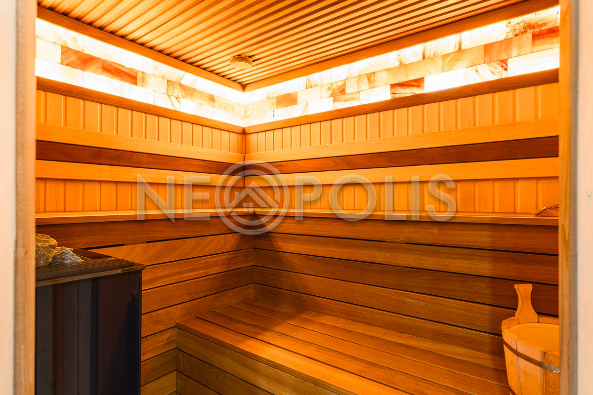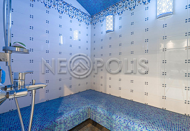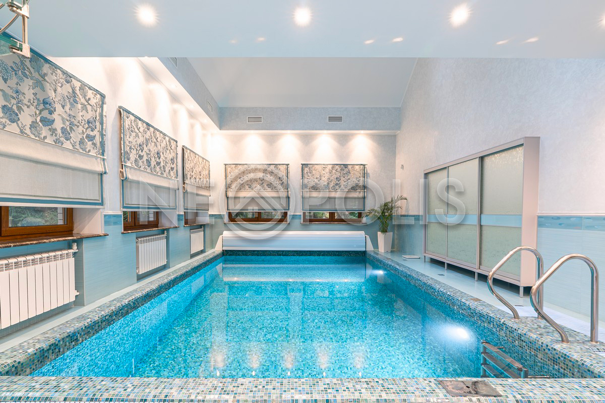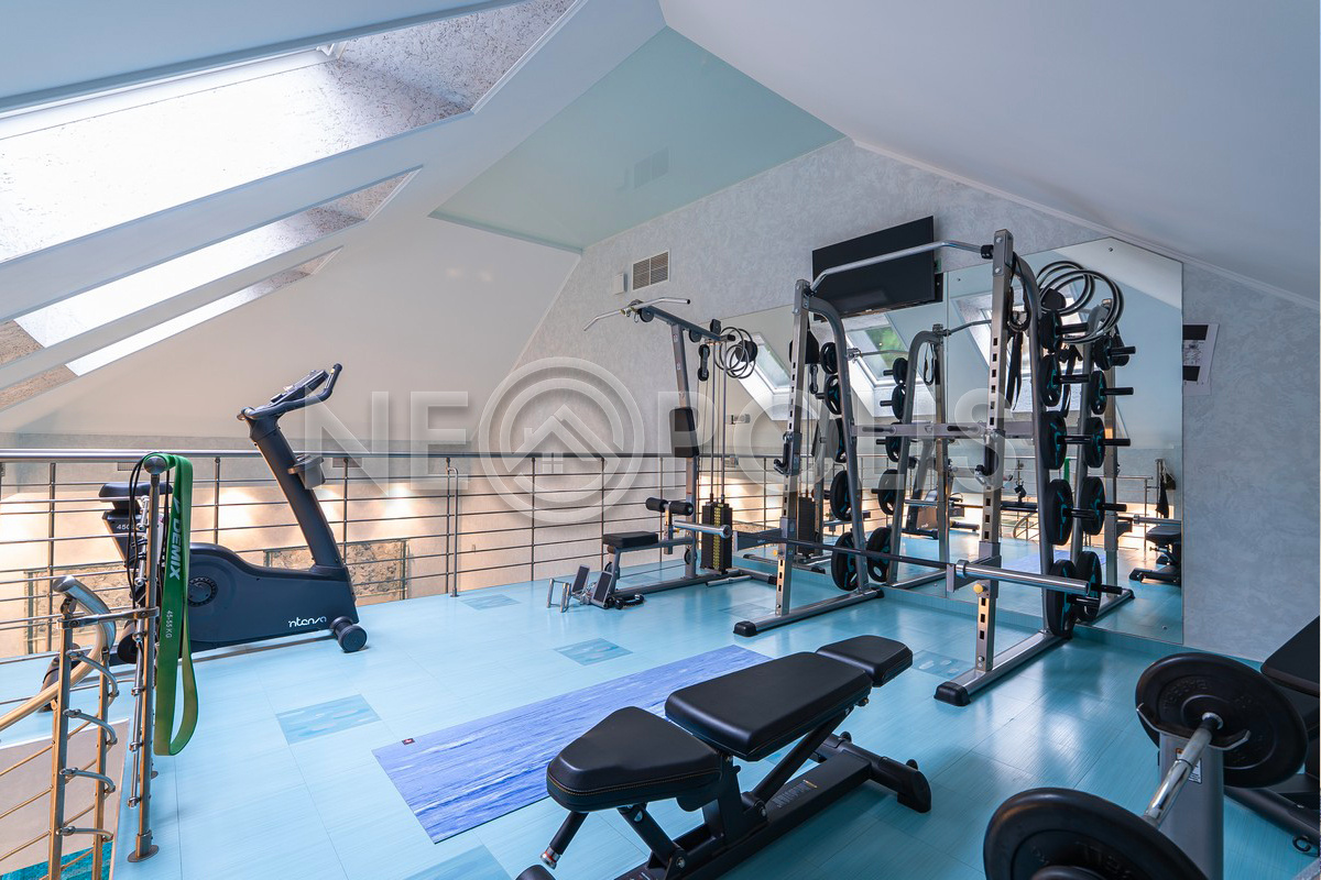 - 1 этаж:прихожая, холл, кухня-столовая, гостиная с камином и выходом на террасу, мастер-блок (спальня, гардеробная, ванная и кухня-гостиная), гардеробная, коридор, кабинет, санузел, SPA зона: бассейн (6х4м, глубина 1.6м.), сауна, хамам, санузел с душевой, тренажерный зал; постирочная, кладовая/винный погреб, котельная.