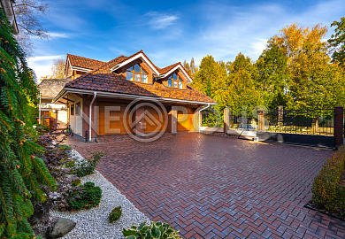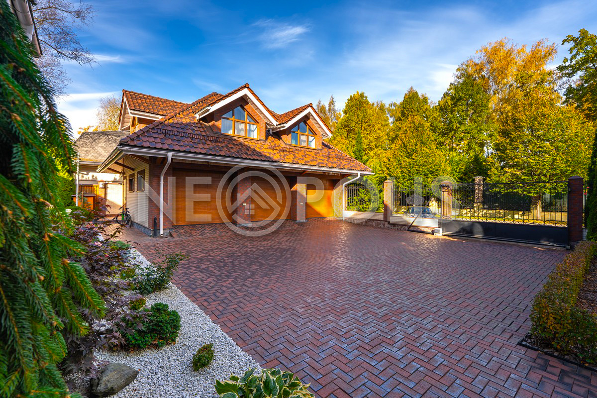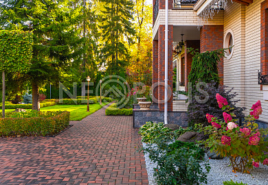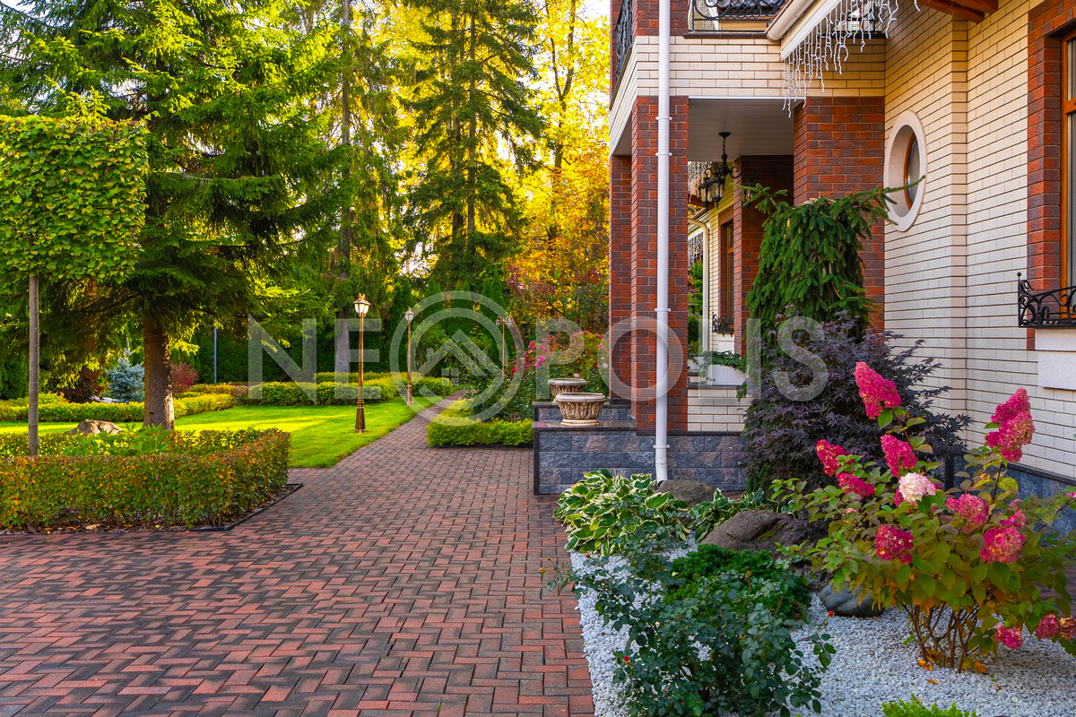 Прогулочные дорожки и просторная зона открытой парковки вымощены клинкерной брусчаткой из Германии. В вечернее время участок преображается благодаря декоративному уличному освещению.