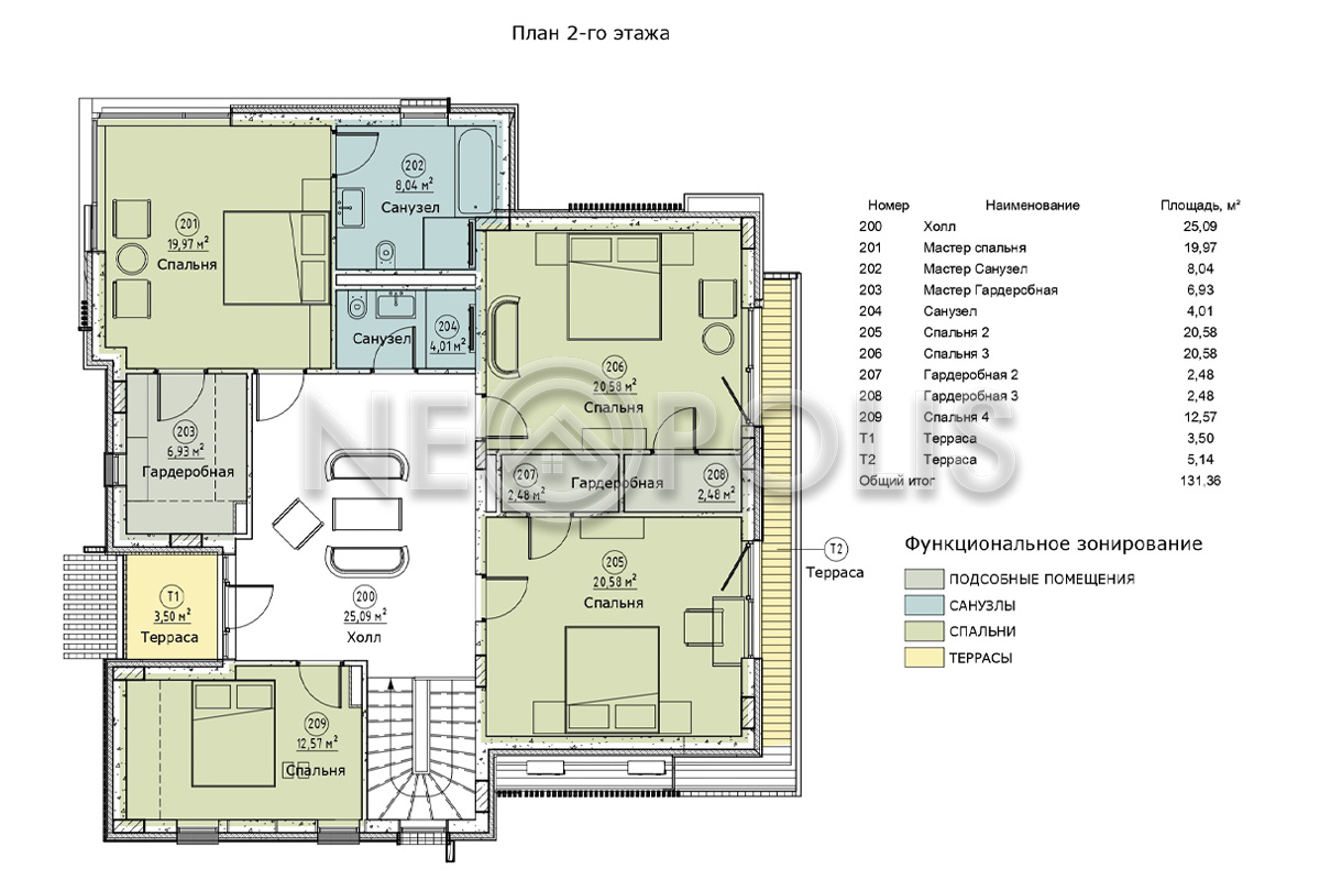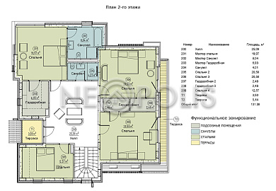 - 2 этаж:холл с выходом на террасу, мастер-спальня с гардеробной и ванной комнатой, две спальни с гардеробными, спальня, санузел.