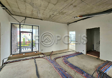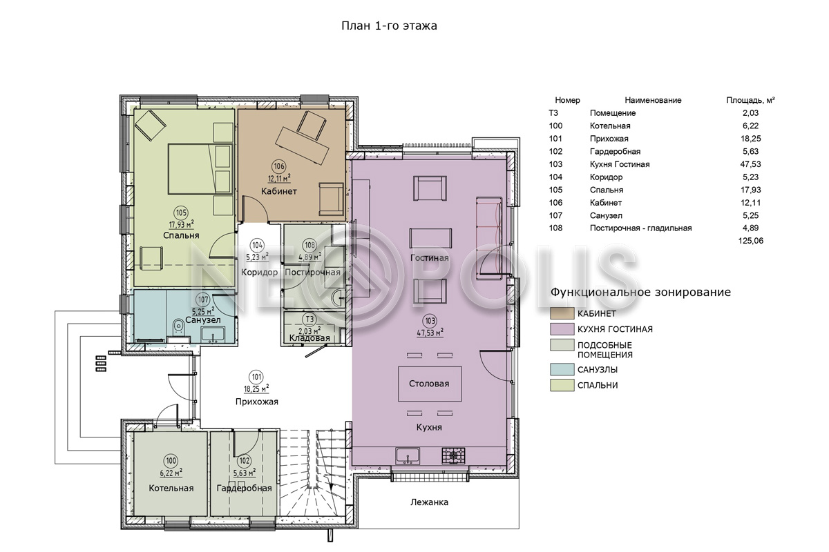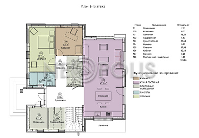 - 1 этаж:крыльцо, прихожая с гардеробной, коридор, кухня-столовая с выходом на террасу, гостиная с выходом на террасу, спальня, кабинет, санузел, постирочная, кладовая, котельная с отдельным входом.