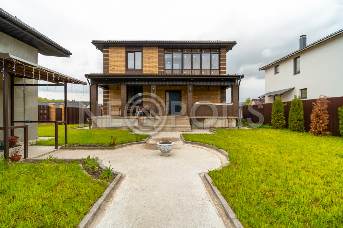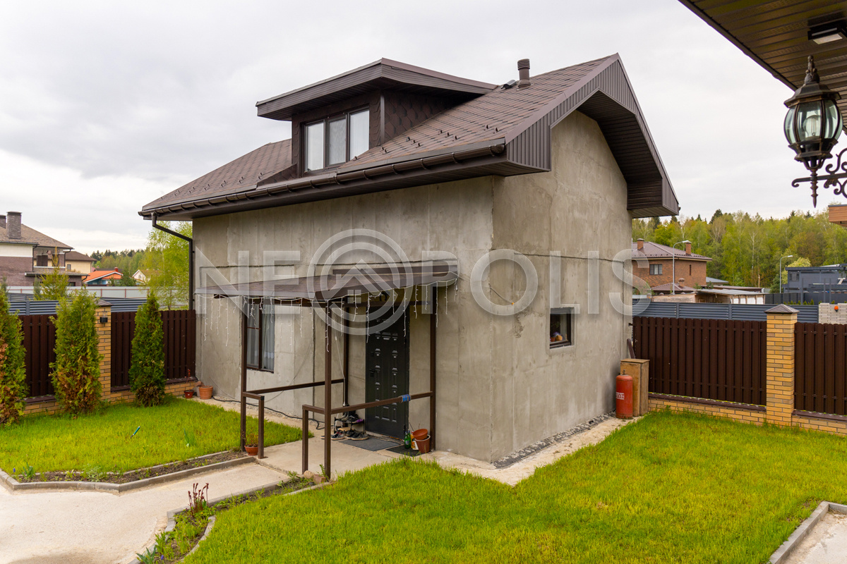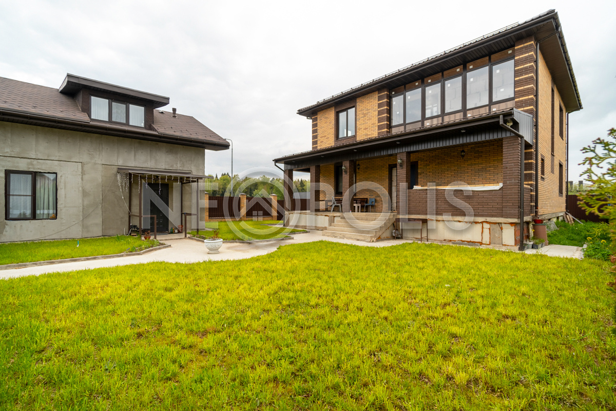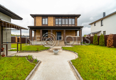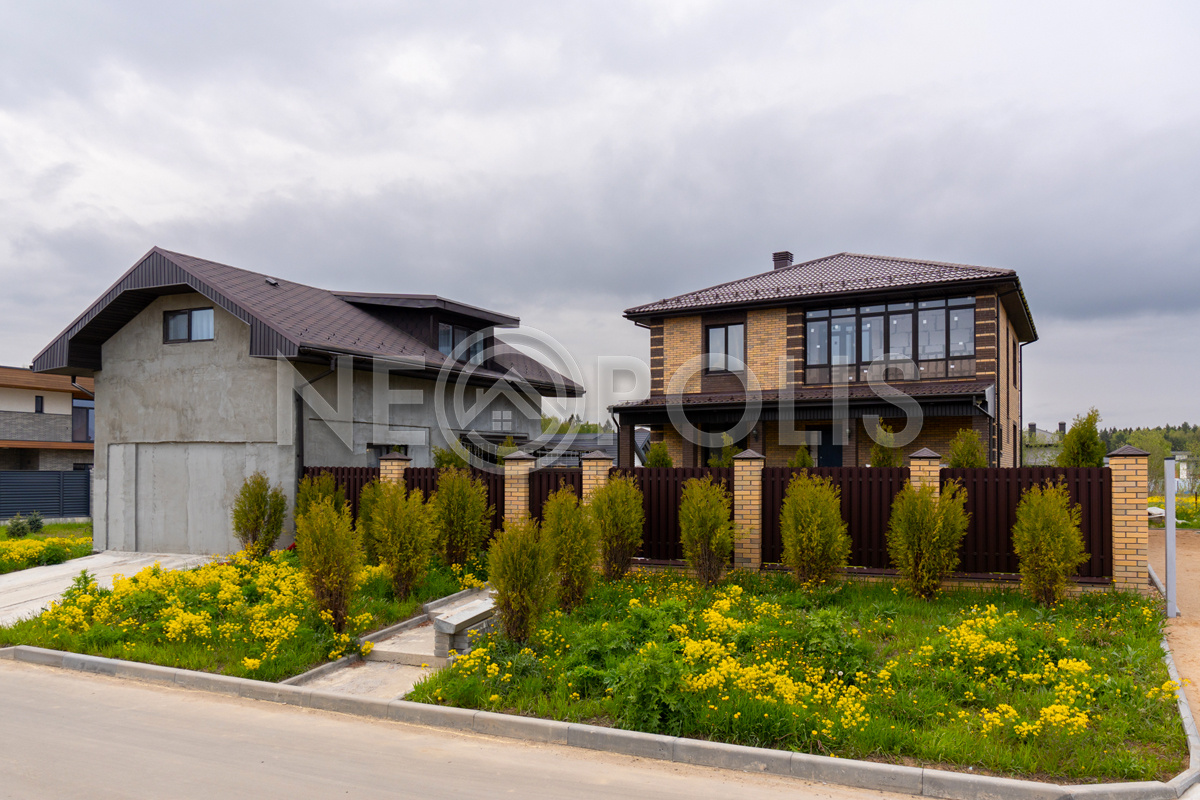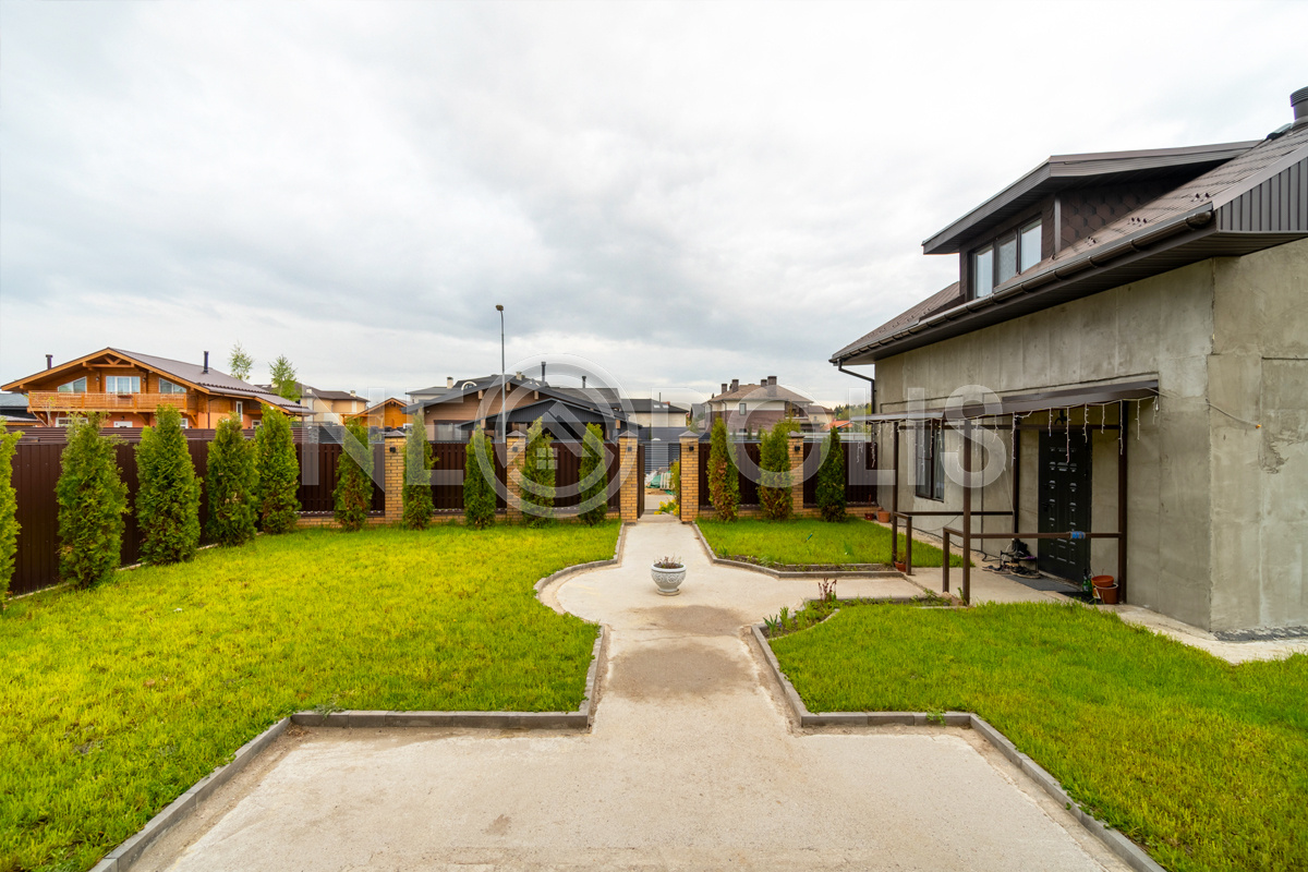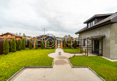 Организован естественный газон, дорожки бетонные с бордюрами, отмостка, бетонная площадка под 2 больших авто; разведено уличное освещение (на колоннах и на доме).