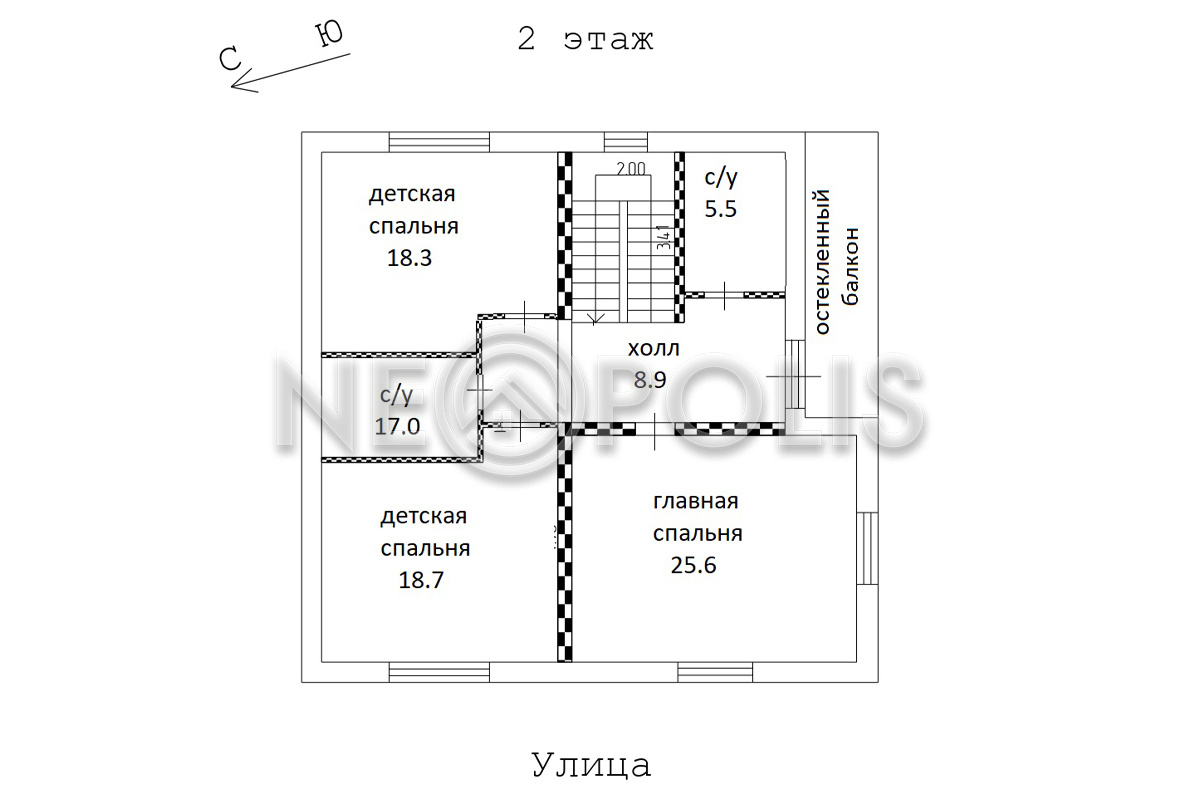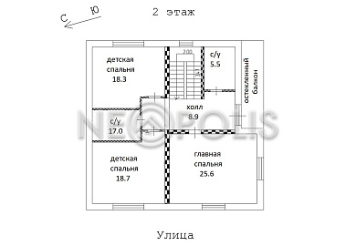 - 2 этаж:холл с выходом на балкон, три спальни, два санузел.