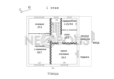 - 1 этаж:крытое крыльцо, холл с гардеробной, кухня-столовая, гостиная с камином, спальня, санузел.