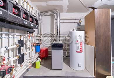 центральная, бойлер на 300л с электрообогревателем; есть 3 картриджа грубой очистки воды и многоступенчатая очистка воды (для умягчения)