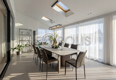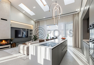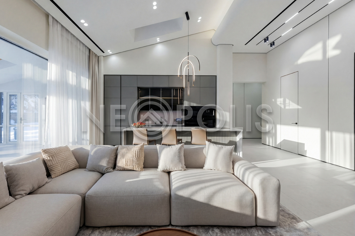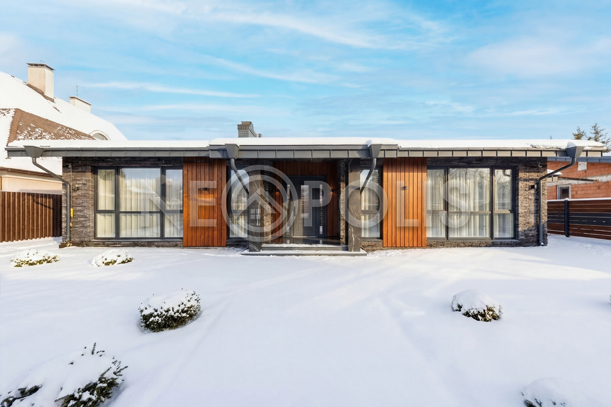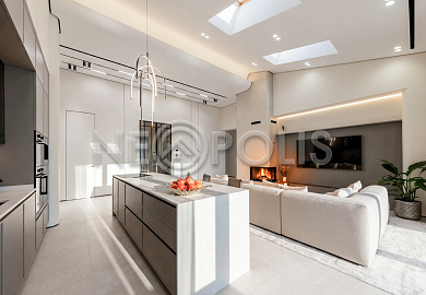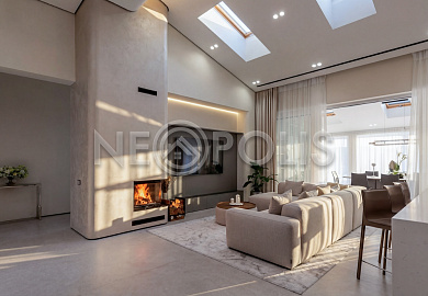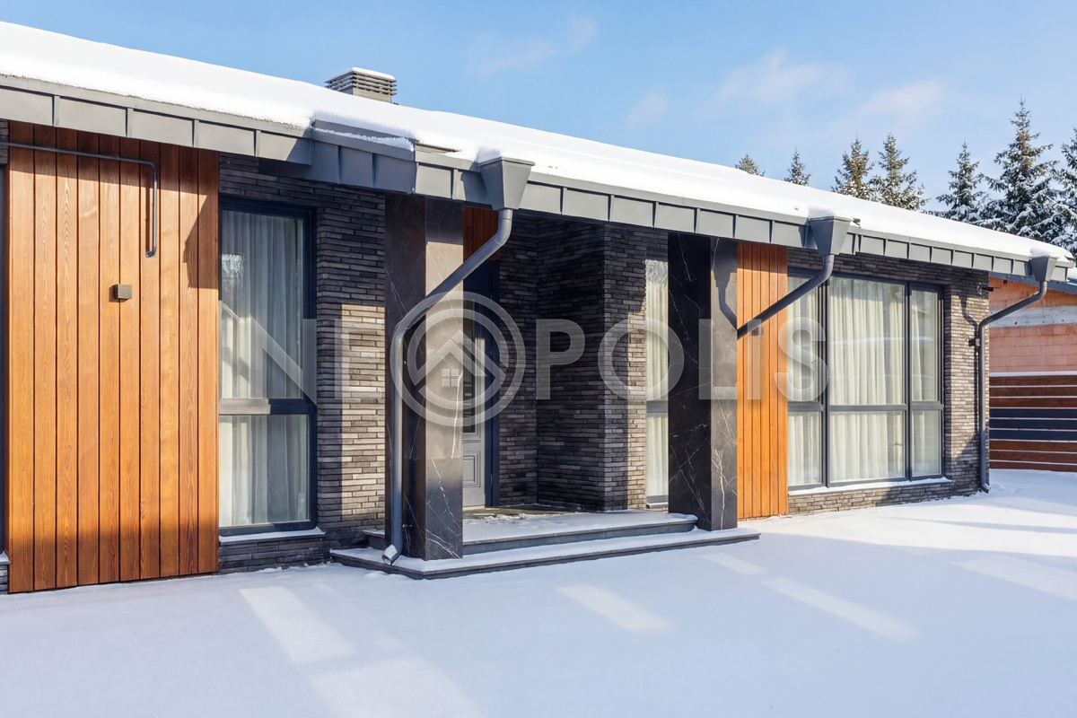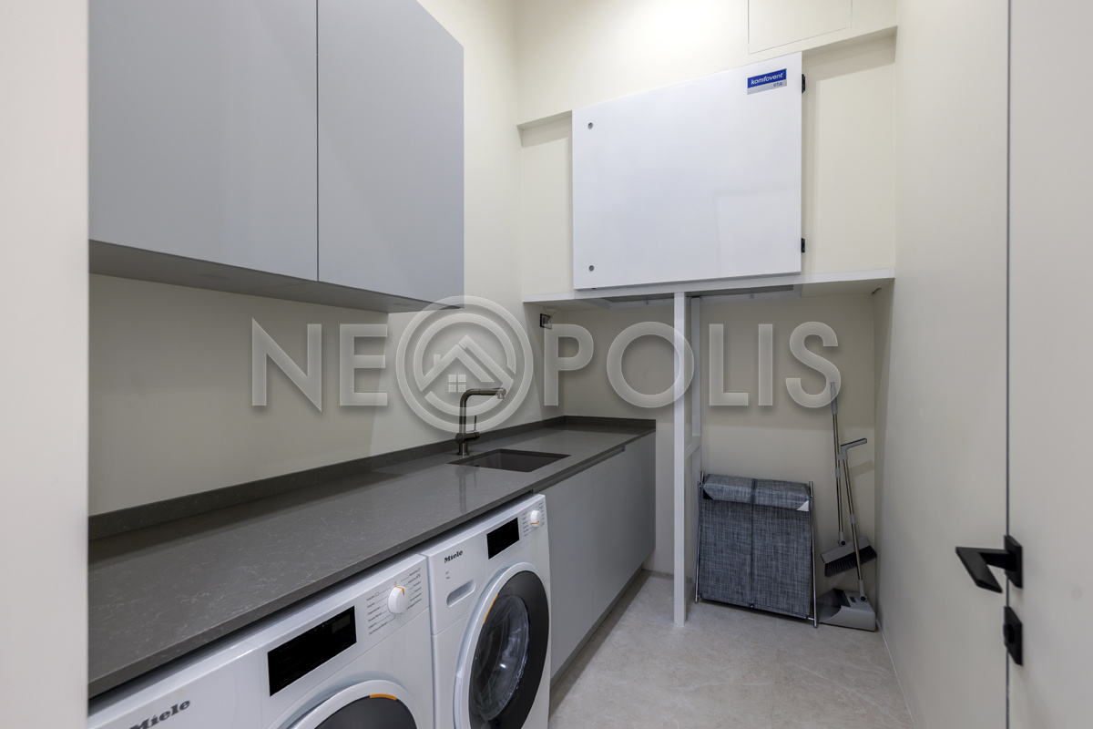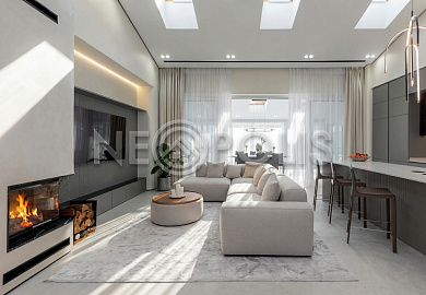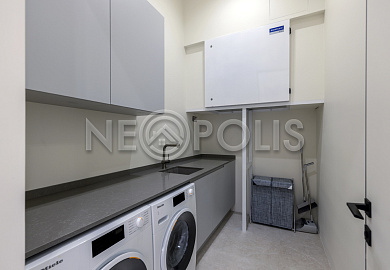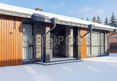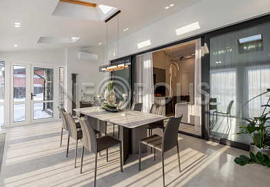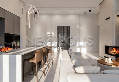 - 1-й этаж:прихожая, гардеробная, кухня, гостиная с дровяным камино, столовая зона с панорамным остеклением и выходом на участок, черновая кухня, гостевой санузел, постирочная комната, хозяйский блок с большой гардеробной и санузлом, две мастер-спальни гардеробными и санузлами, кабинет, котельная