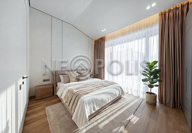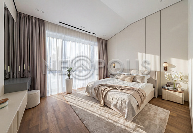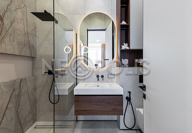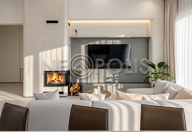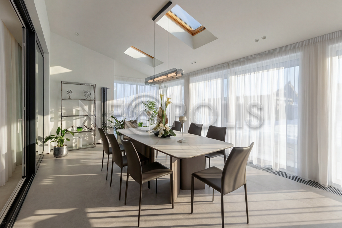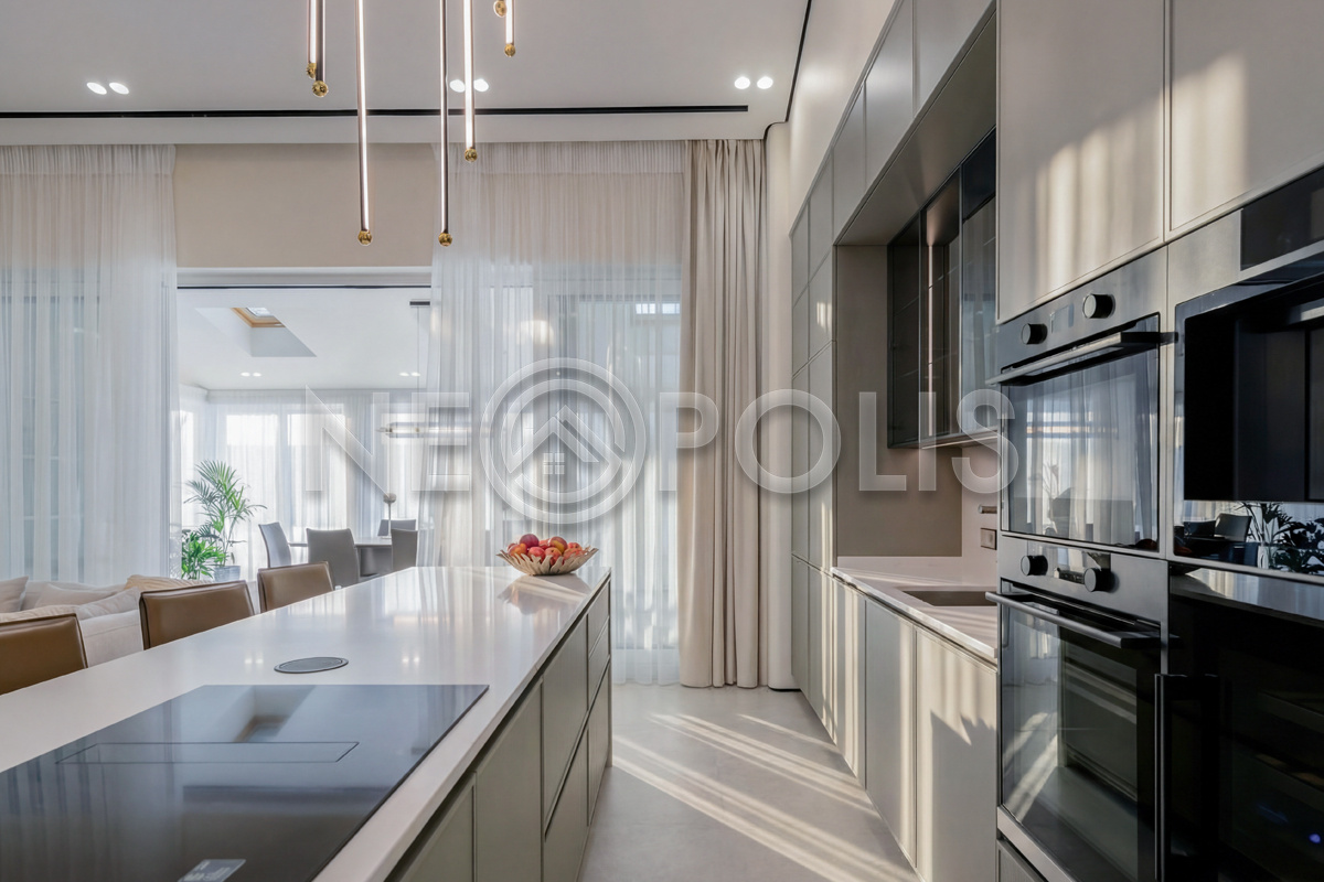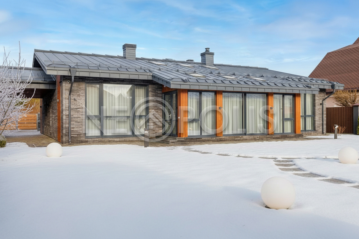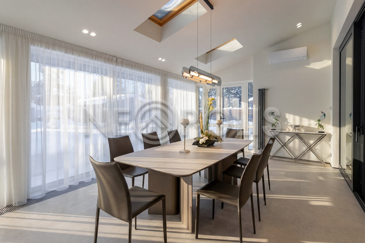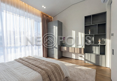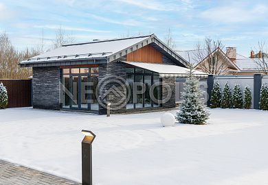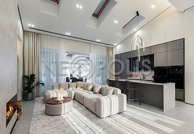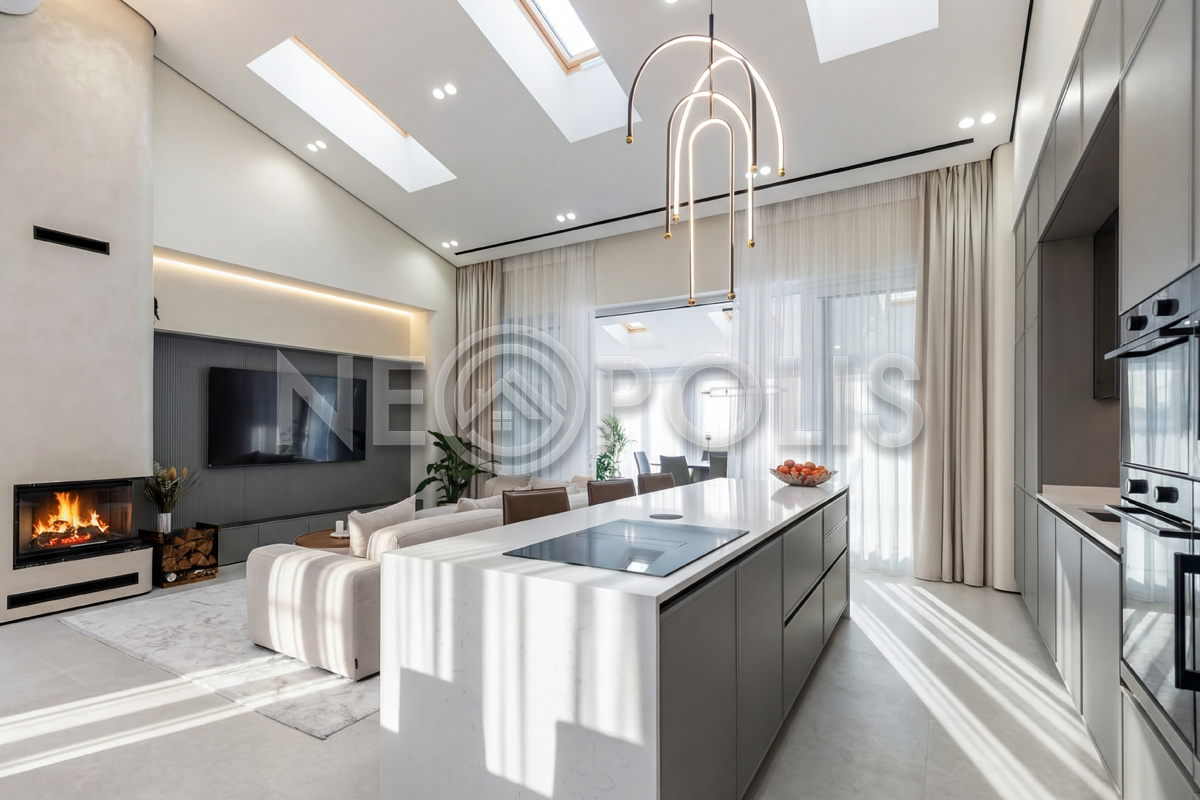 - 1-й этаж:прихожая, гардеробная, кухня, гостиная с дровяным камино, столовая зона с панорамным остеклением и выходом на участок, черновая кухня, гостевой санузел, постирочная комната, хозяйский блок с большой гардеробной и санузлом, две мастер-спальни гардеробными и санузлами, кабинет, котельная