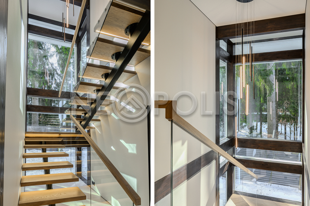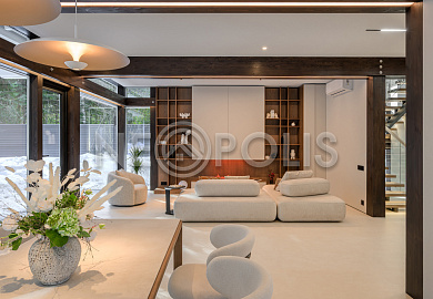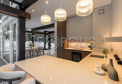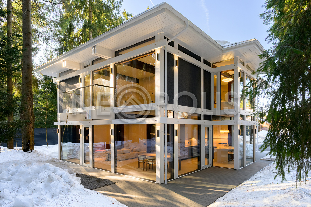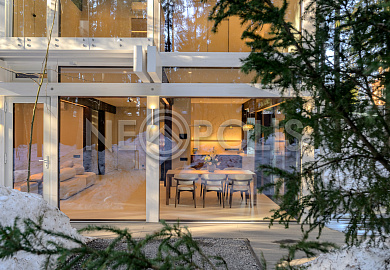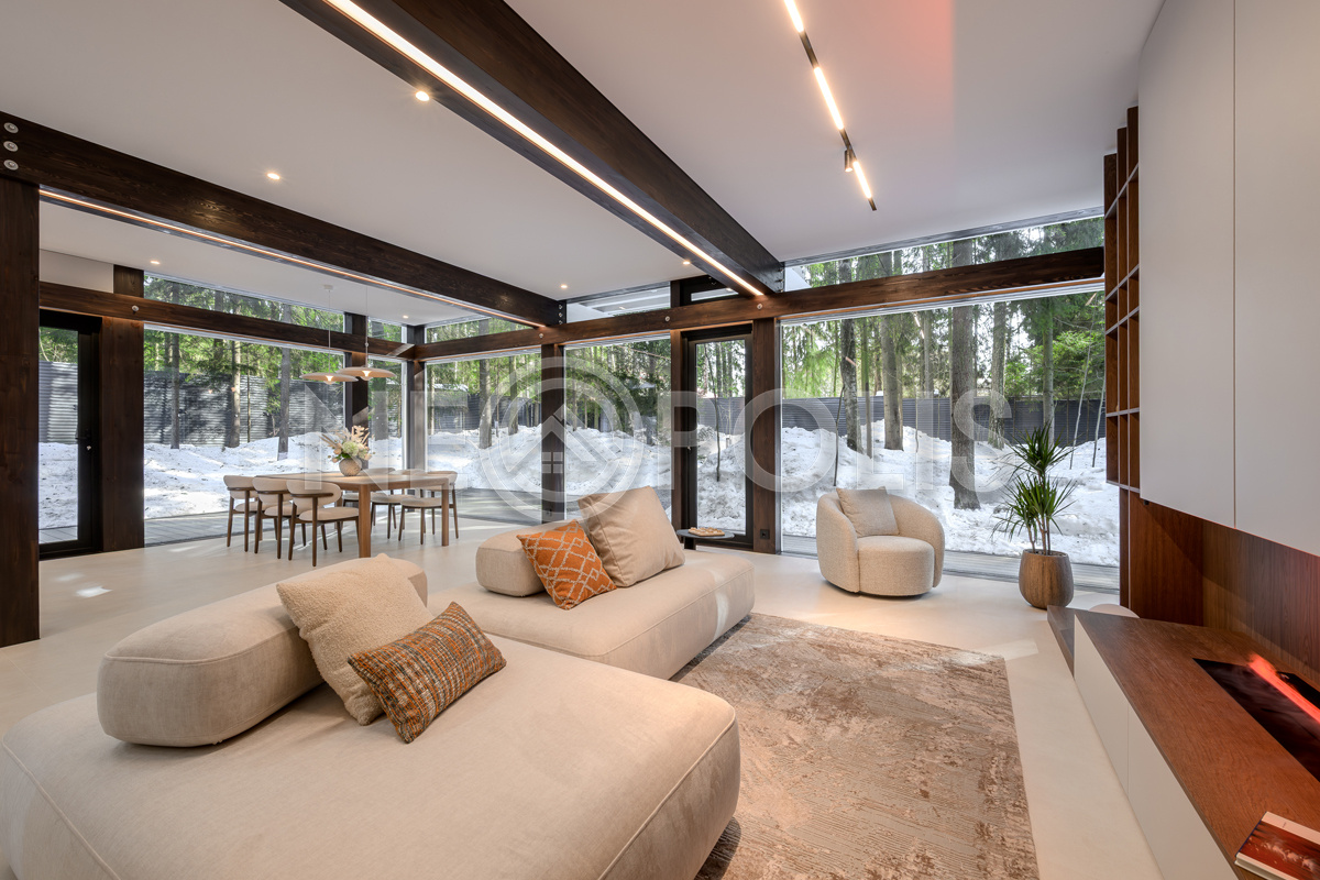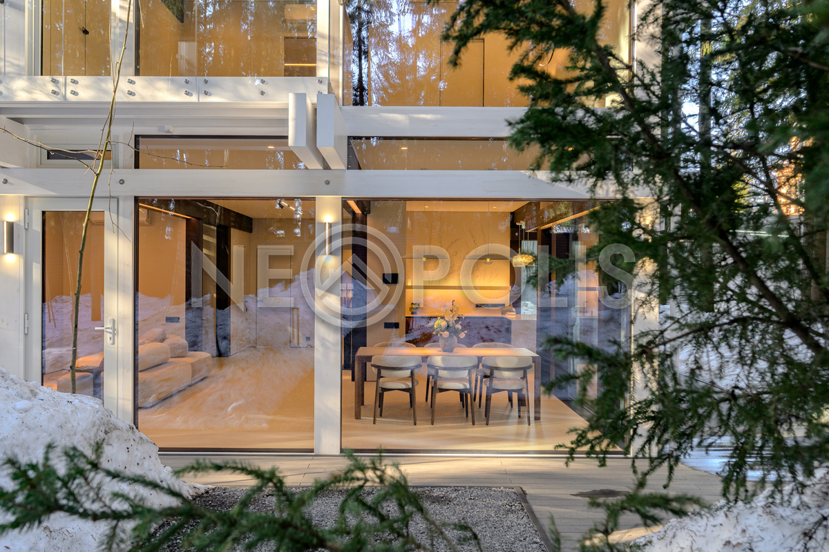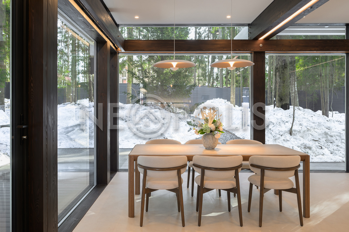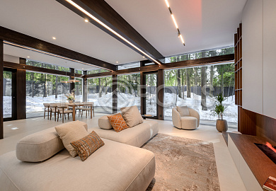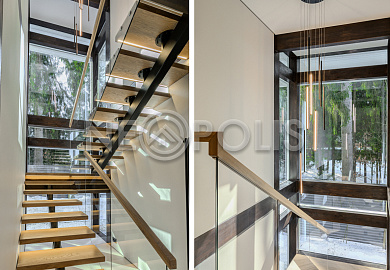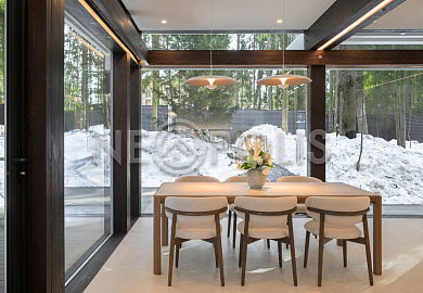 Стеклянные стены от пола до потолка. • Потрясающие виды на собственный участок. • Продуманная планировка • Высокие потолки. • Высококачественная отделка. • Авторская объемная роспись стены на кухне в природных мотивах. • Современные инженерные системы и оснащение.