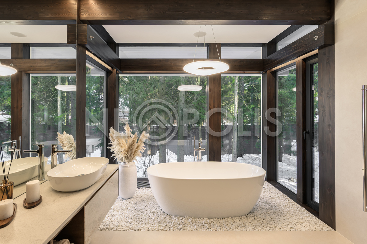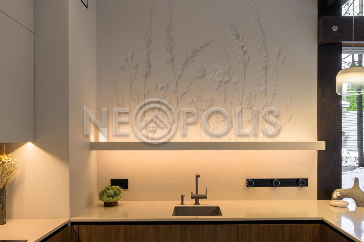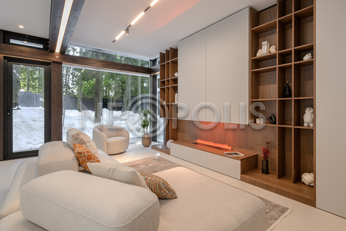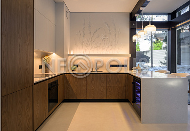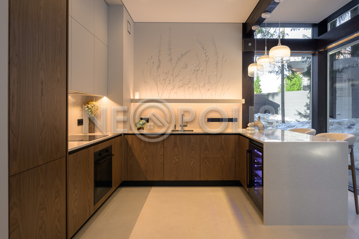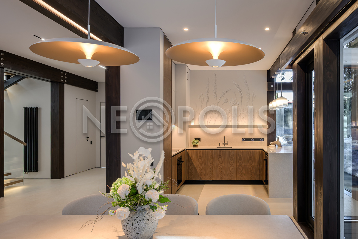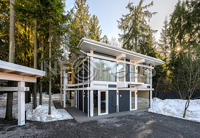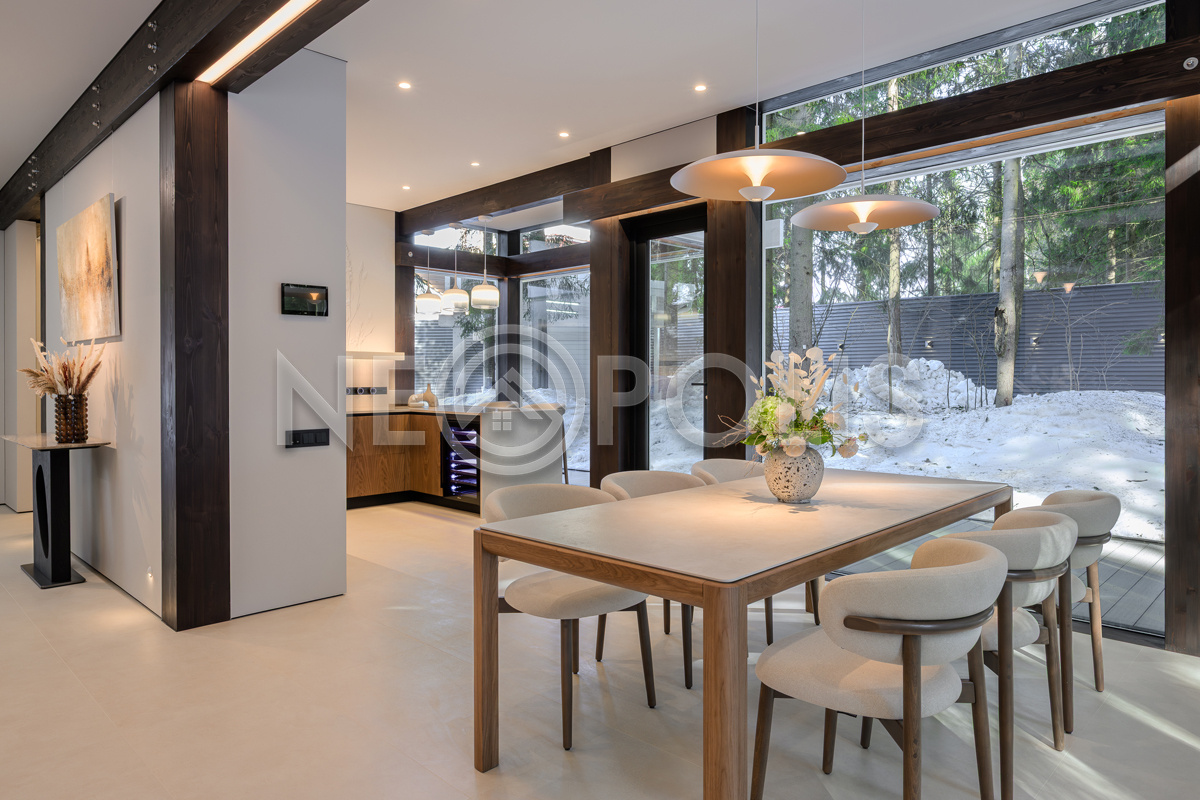 Стеклянные стены от пола до потолка. • Потрясающие виды на собственный участок. • Продуманная планировка • Высокие потолки. • Высококачественная отделка. • Авторская объемная роспись стены на кухне в природных мотивах. • Современные инженерные системы и оснащение.
