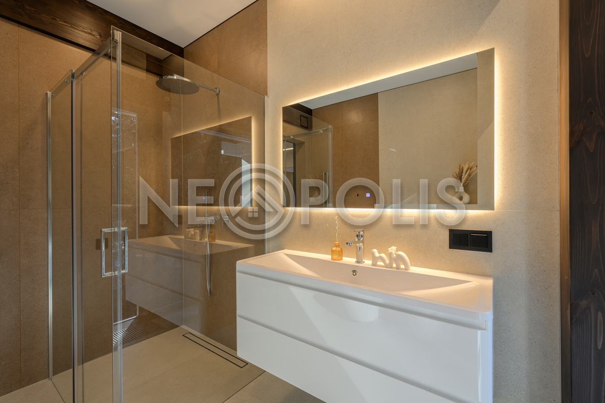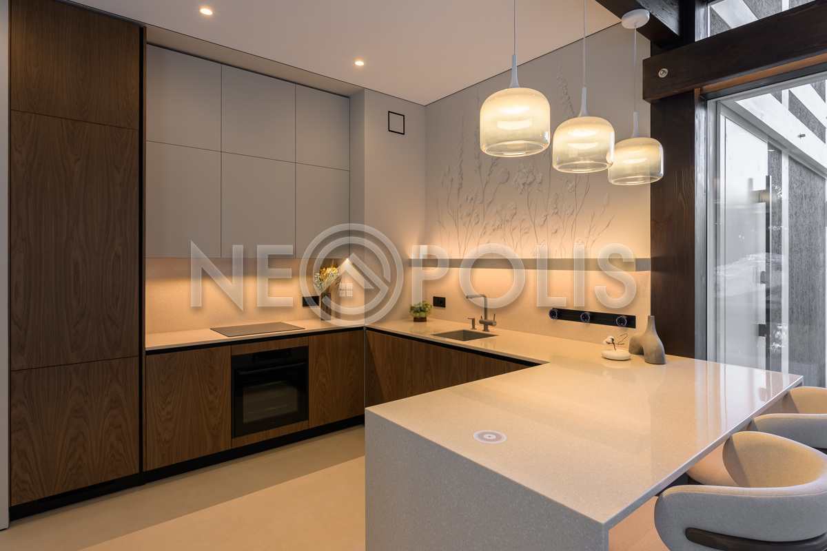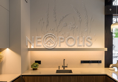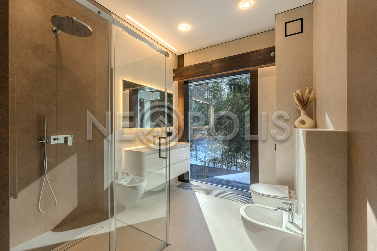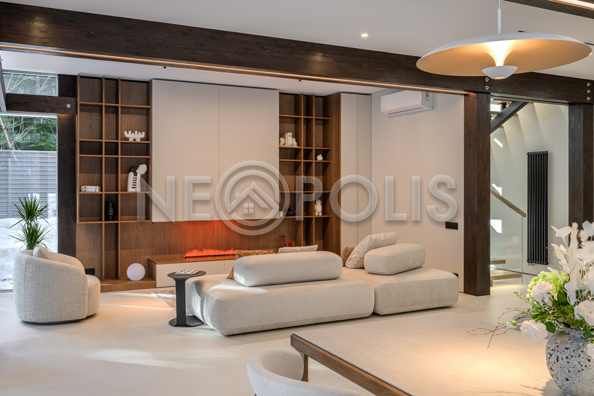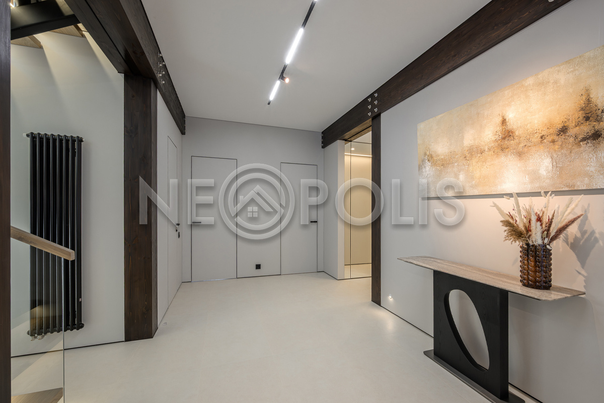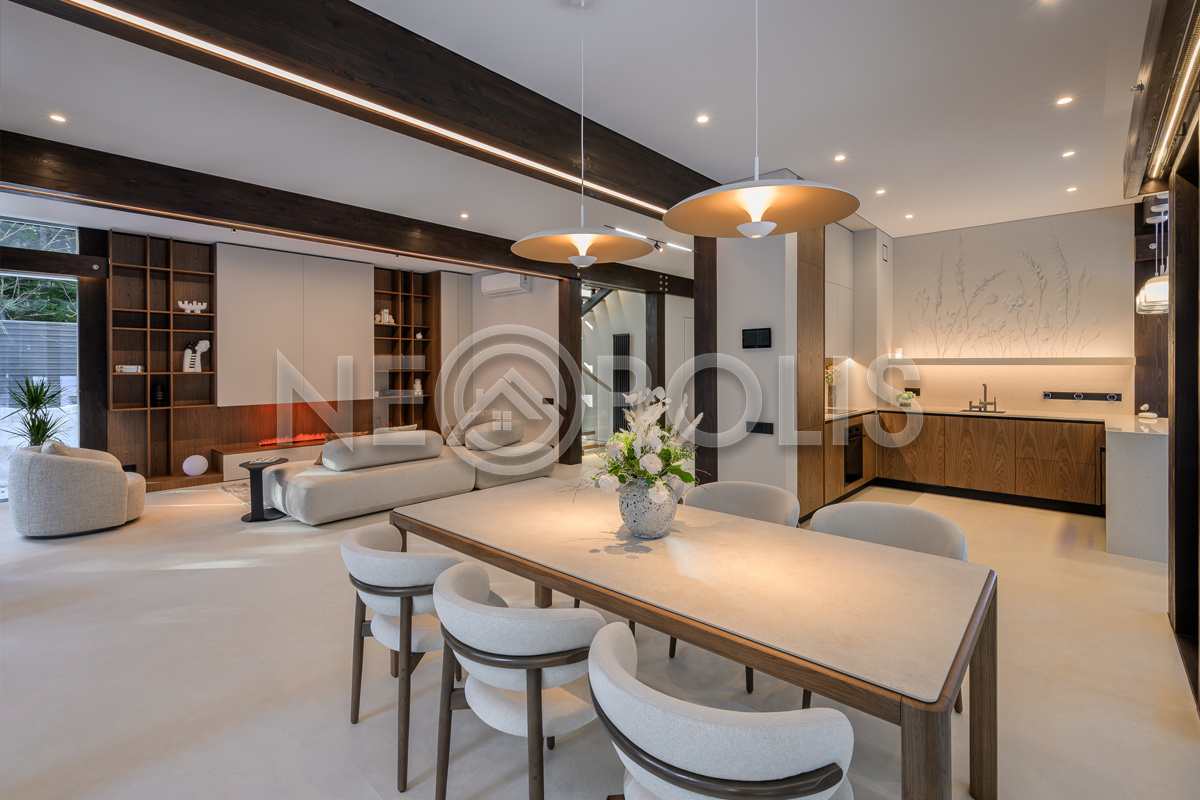 Стеклянные стены от пола до потолка. • Потрясающие виды на собственный участок. • Продуманная планировка • Высокие потолки. • Высококачественная отделка. • Авторская объемная роспись стены на кухне в природных мотивах. • Современные инженерные системы и оснащение.