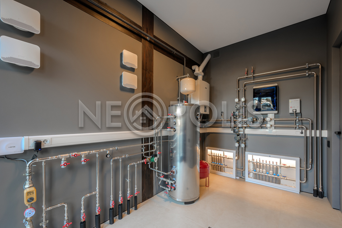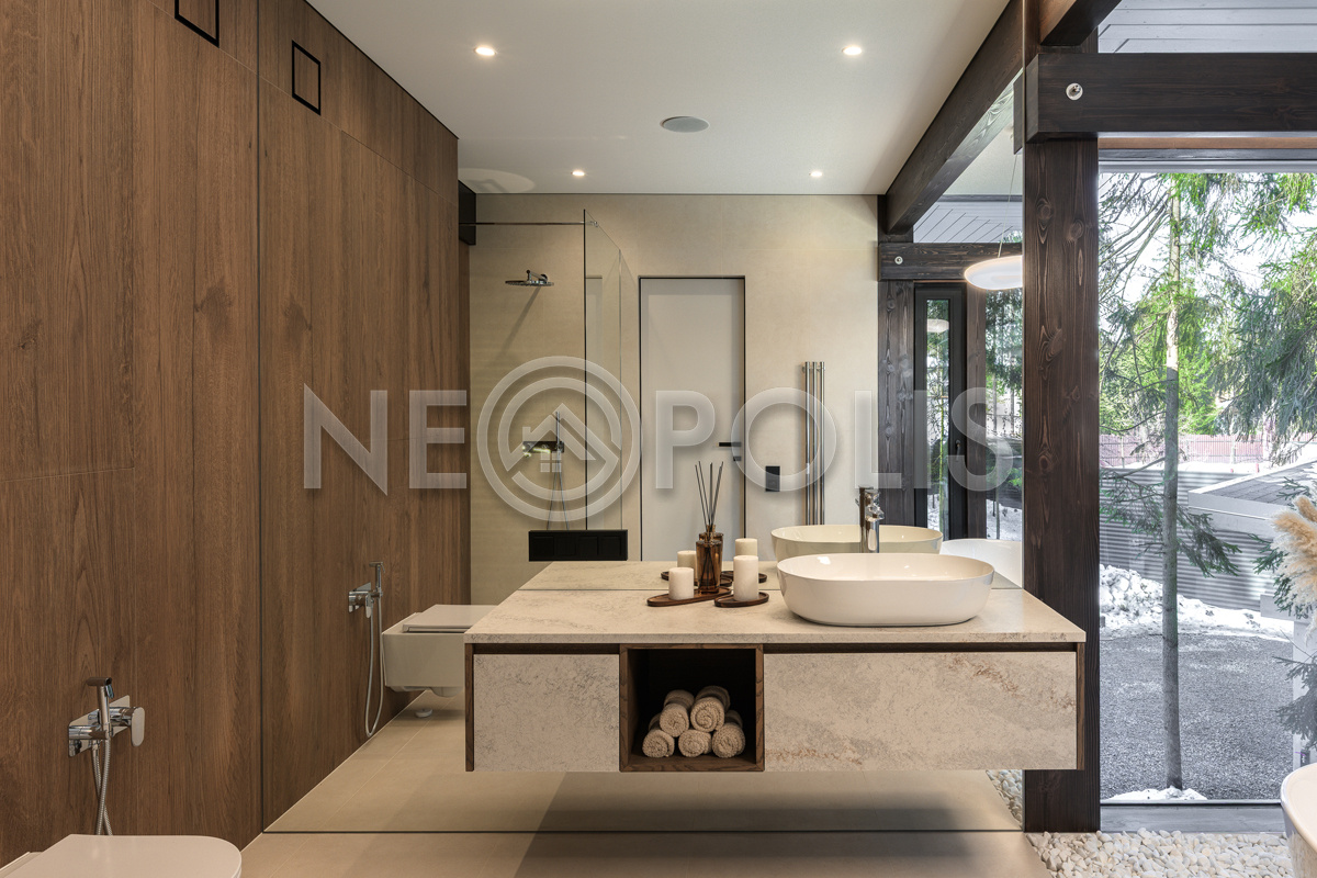 - 1-й этаж:Гостиная-столовая, кухня, терраса, санузел, гостевая спальня, котельная-постирочная, гардеробная