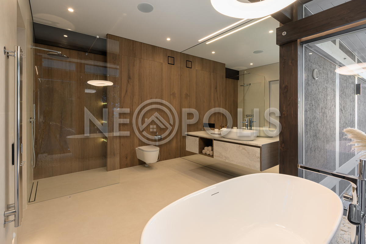 - 2-й этаж:Мастер-спальня с гардеробной ванной и балконом, спальня с гардеробной, детская комната, балкон, холл, санузел