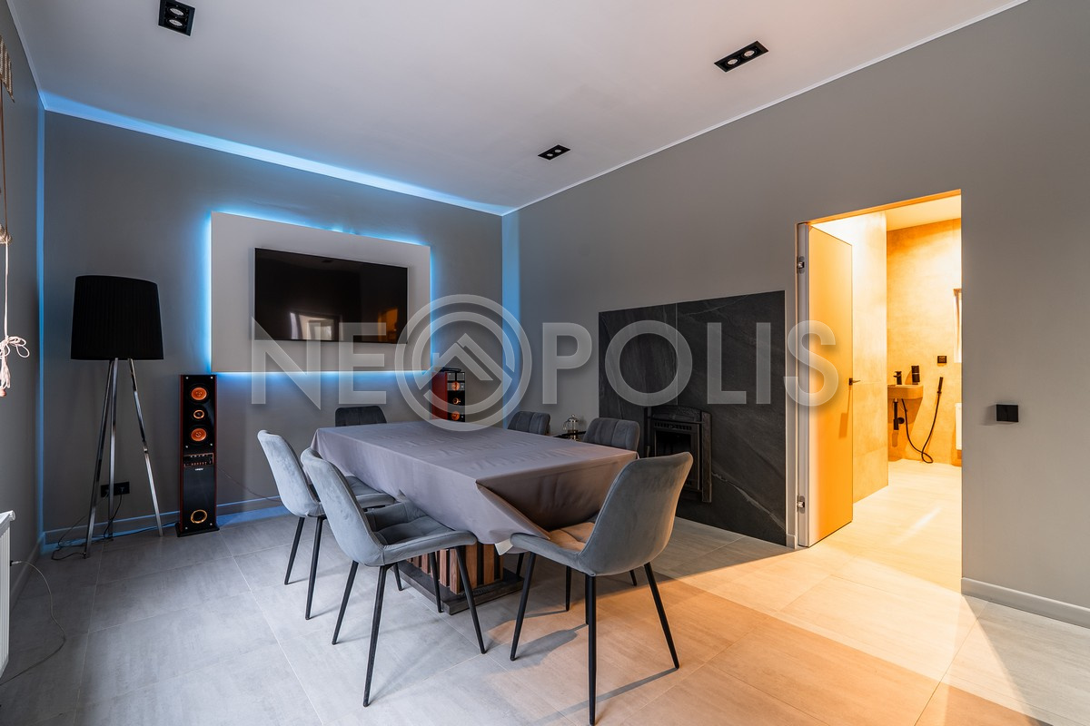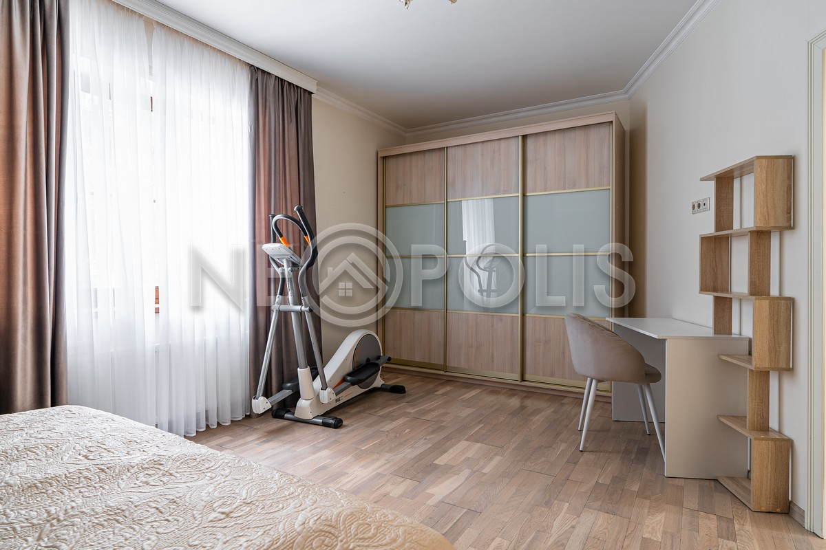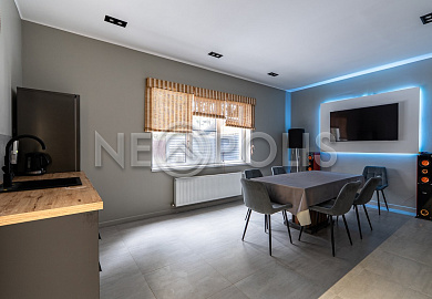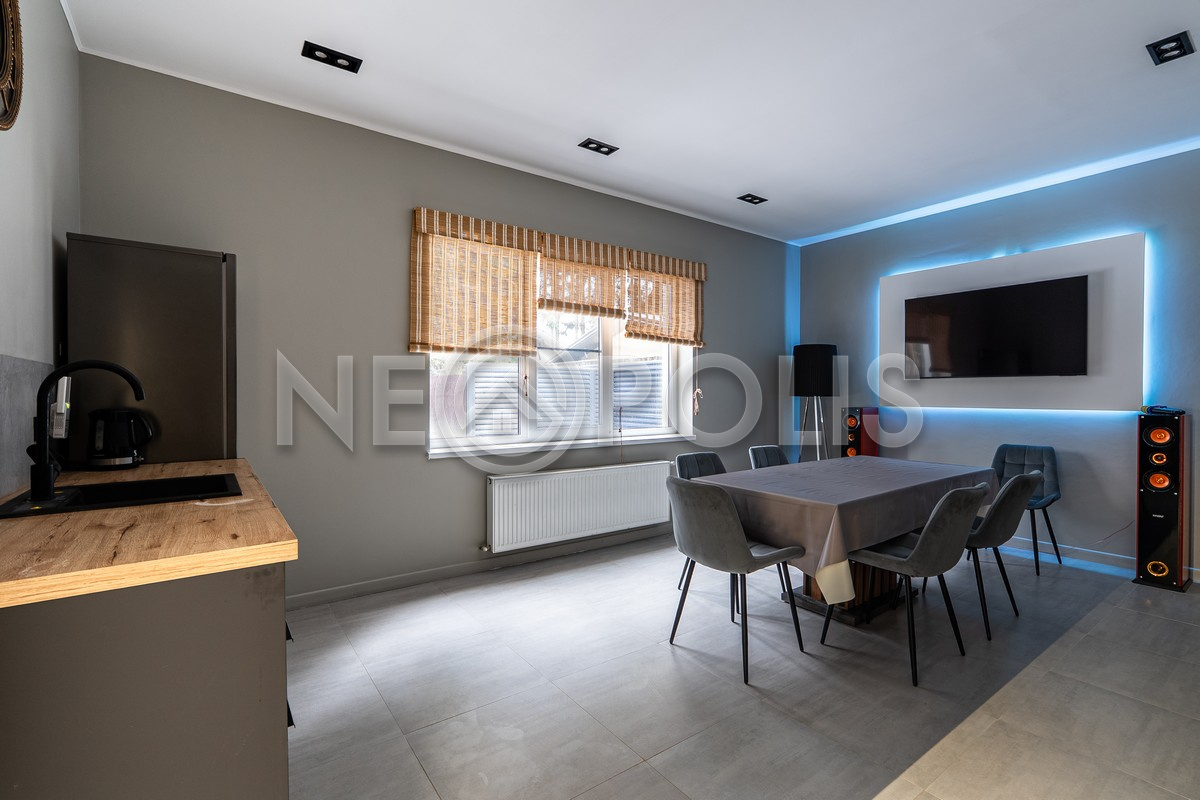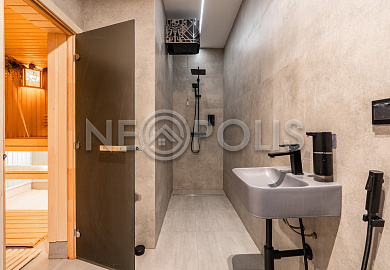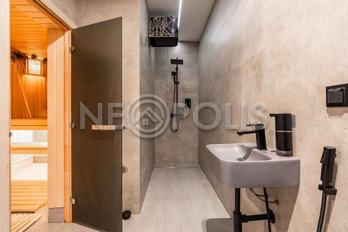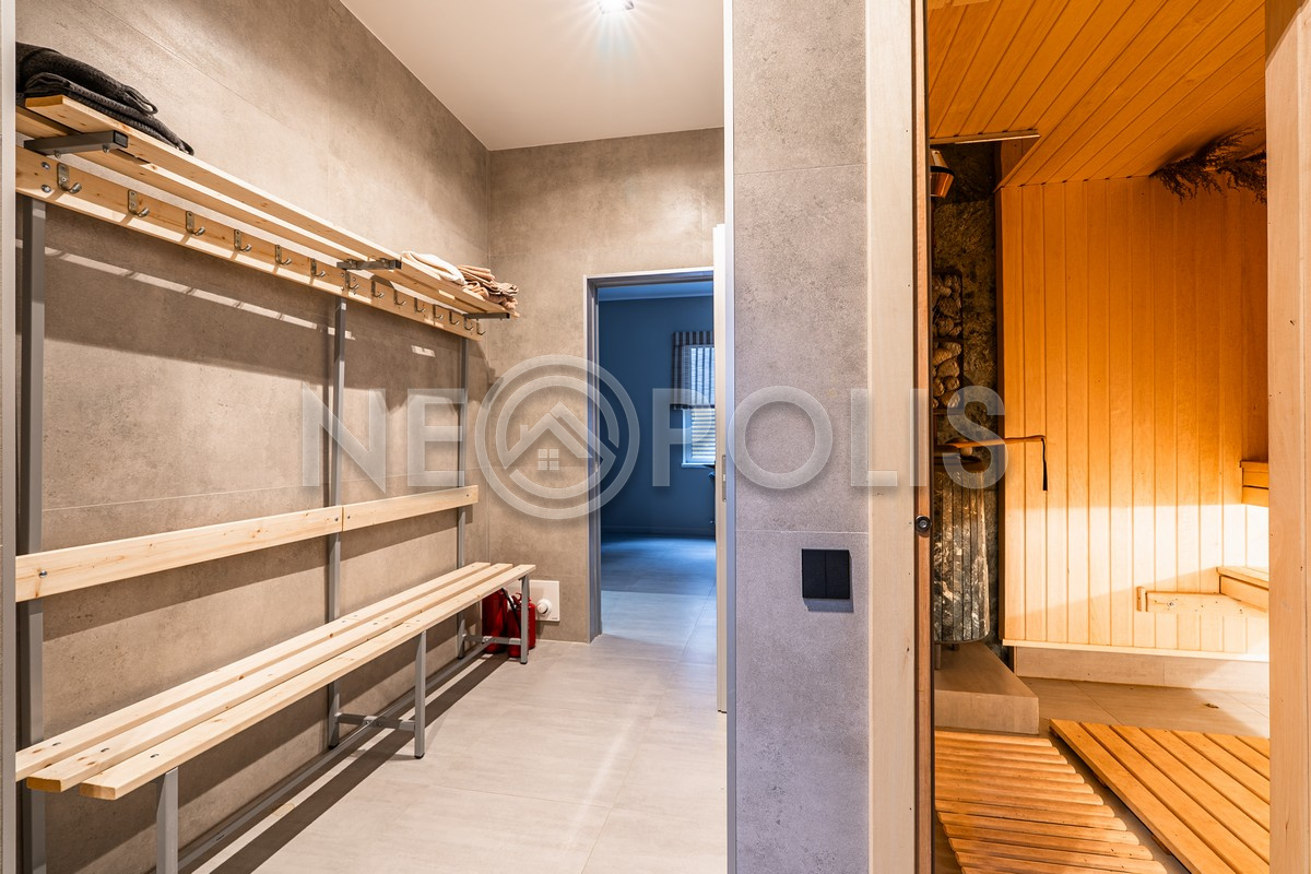 Санузел с душем, раздевалка, большая комната отдыха с телевизионной зоной и уютная гостевая спальня.