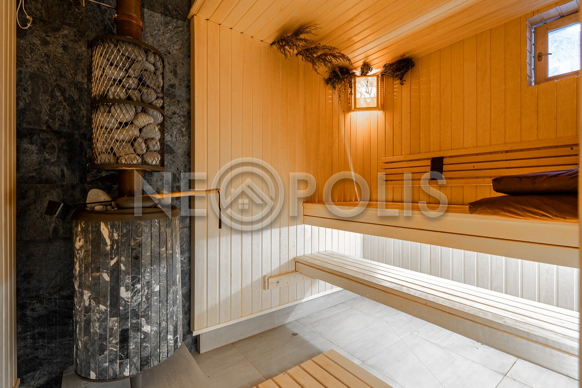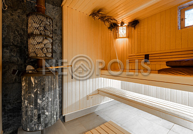 Просторная парилка из дерева кедра, печь на дровах с элементами из натурального камня «Змеевик».