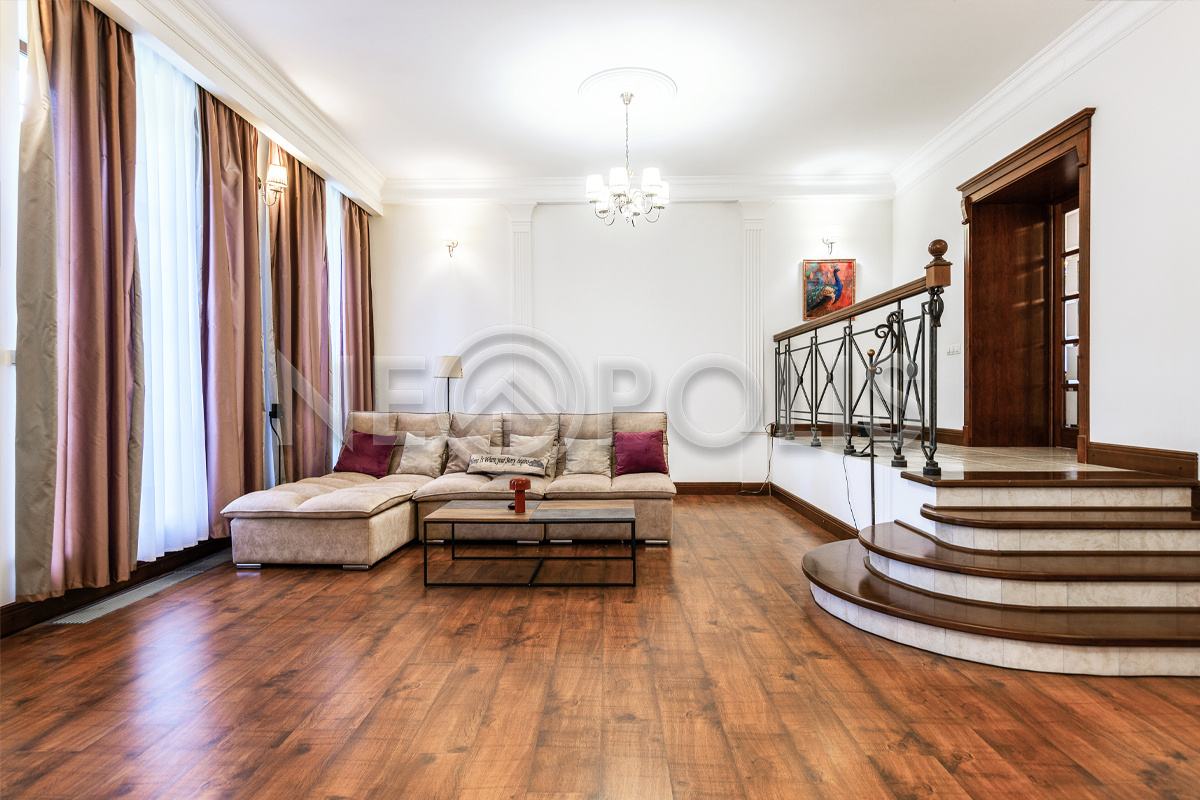 - Лестница: монолитное основание, ступени - массив ясеня, подступеньки - плитка, ограждения - ковка, перилла - дуб