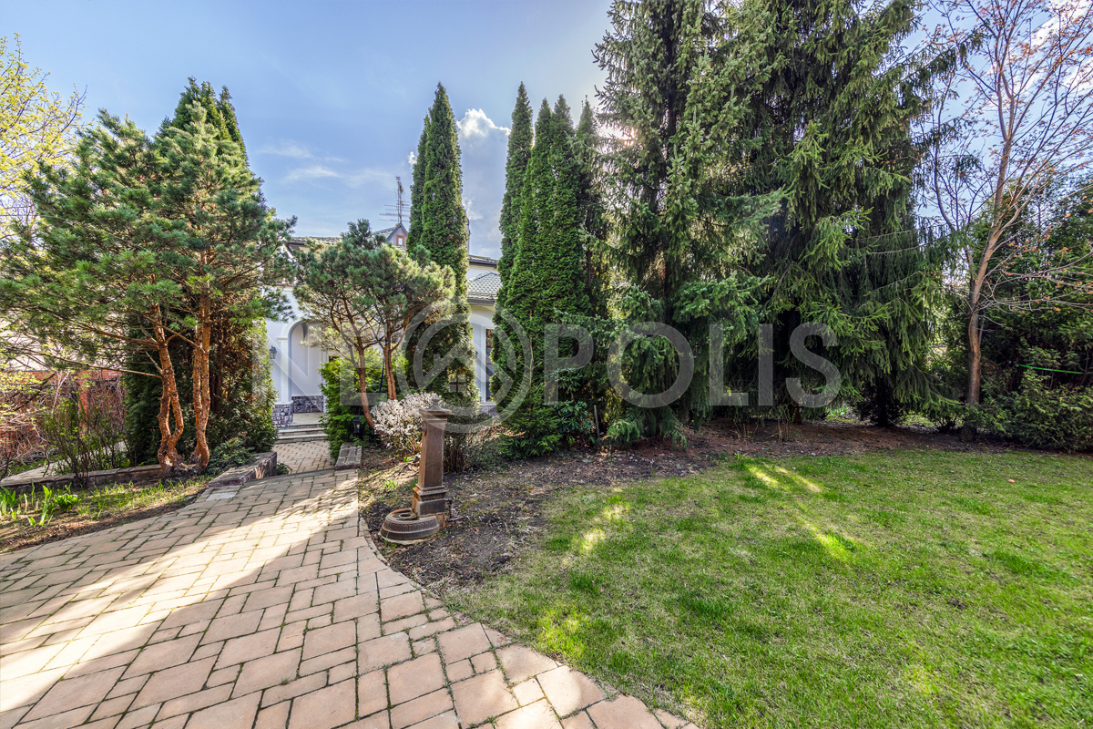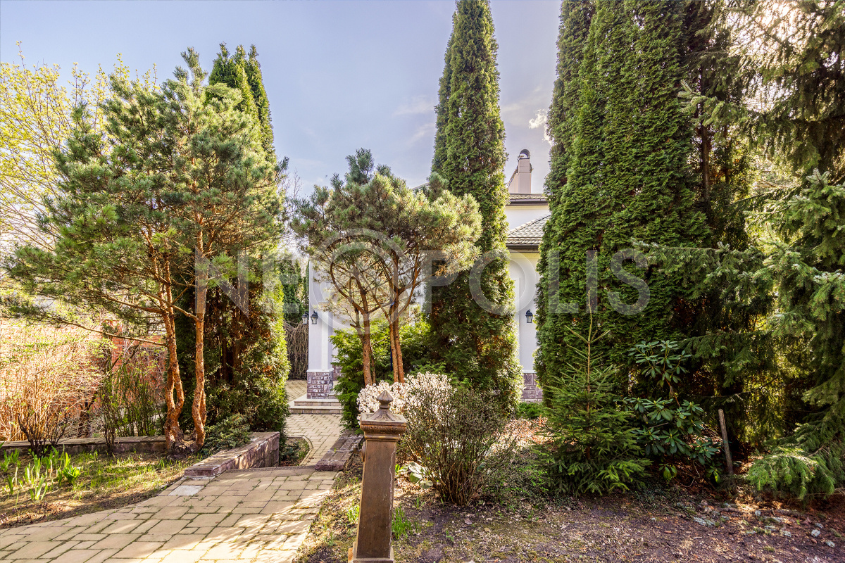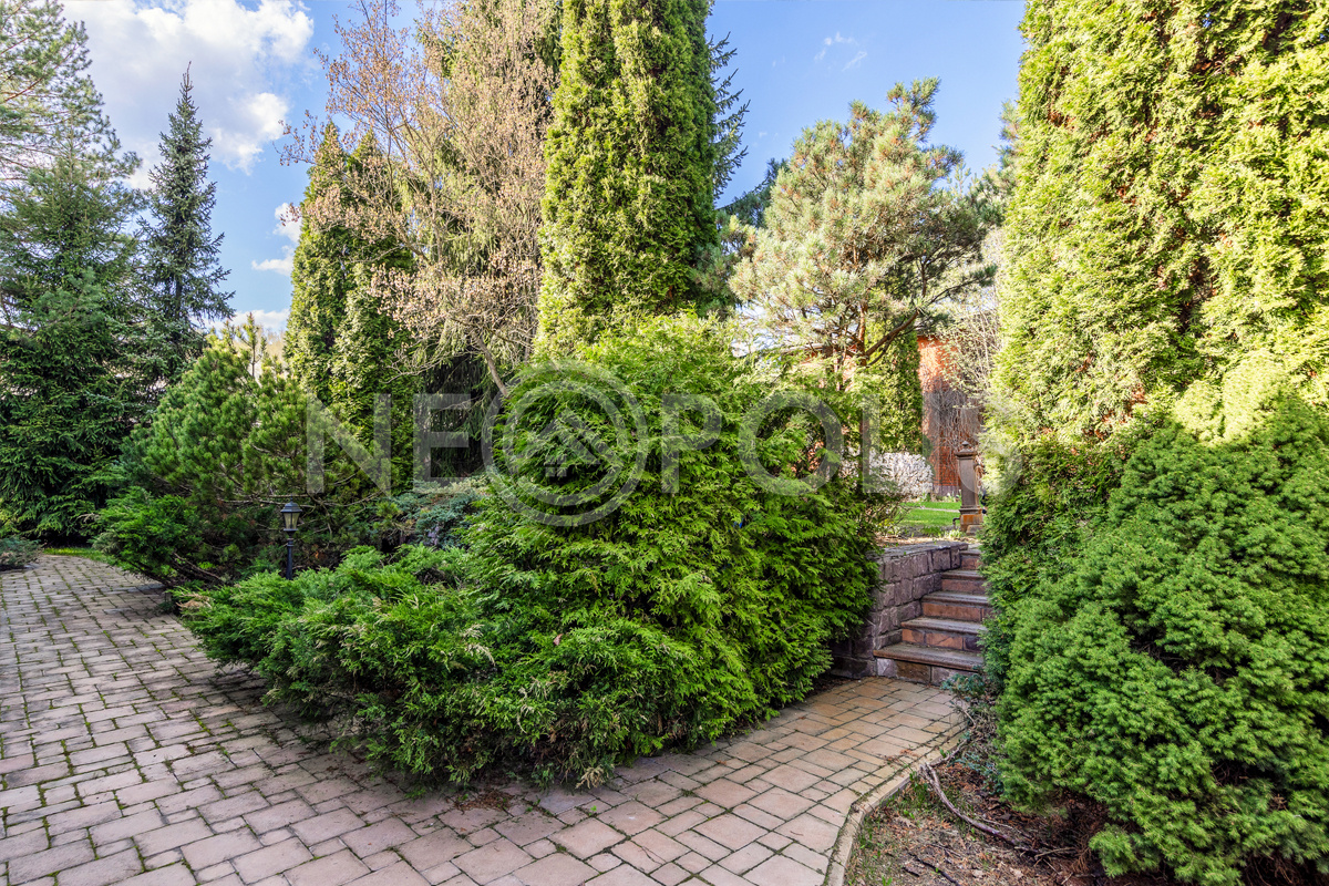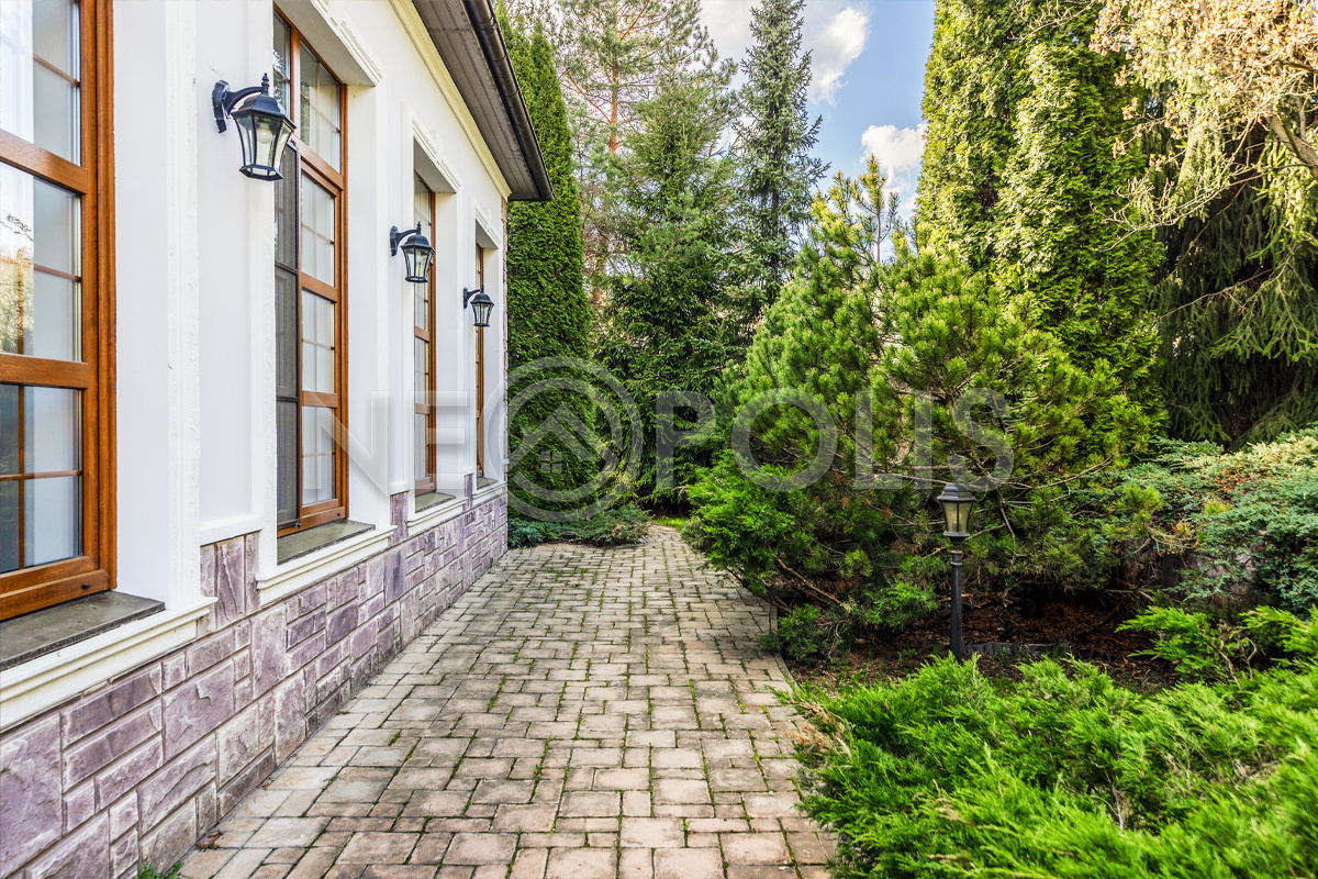 Дорожки на участке вымощены брусчаткой, смонтировано уличное освещение, установлена система "умного полива" с датчиками влажности (можно управлять через приложение).