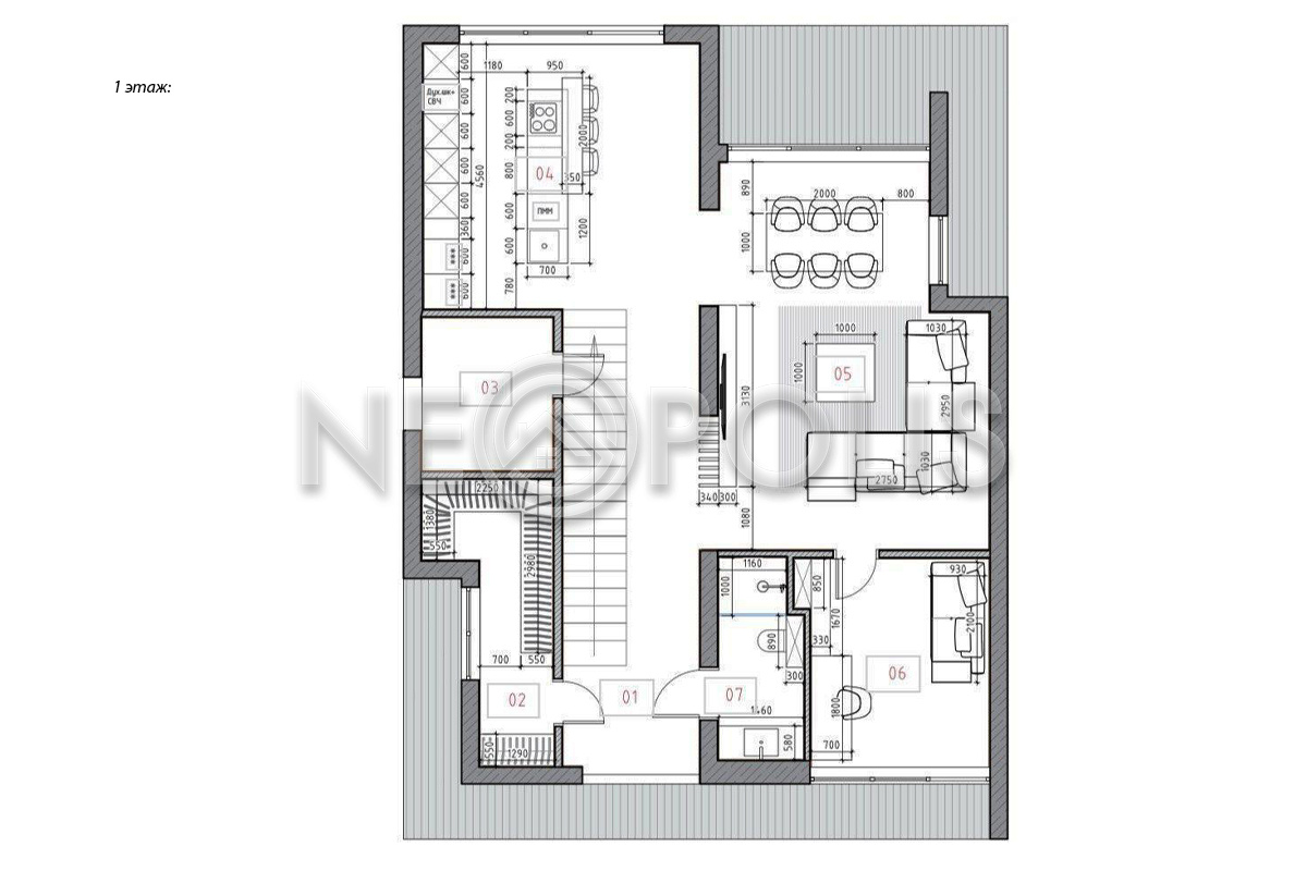 - 1 этаж:холл с гардеробной, кухня, столовая с выходом на террасу, гостиная, кабинет, санузел, котельная.