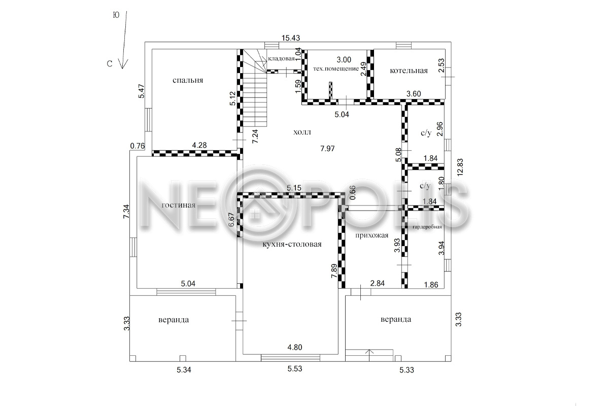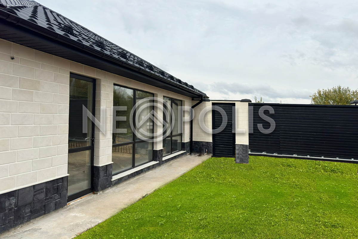 - 1 этаж:холл с выходом на веранду, кухня-столовая с выходом на веранду, гостиная, спальня, гардеробная, 2 санузла, кладовая, техническое помещение, котельная.