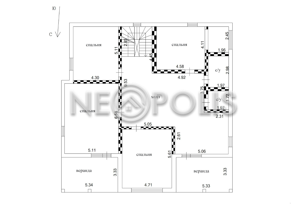 - 2 этаж:холл, спальня с выходом на веранду, 3 спальни, 2 санузла.