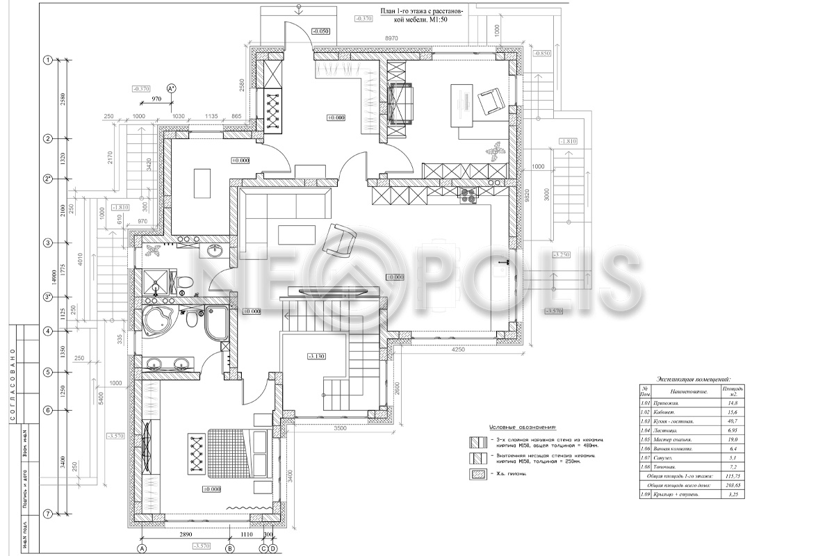 - 1 этаж:прихожая с зоной хранения, кухня-столовая, гостиная, спальня с ванной комнатой, кабинет, санузел, топочная.