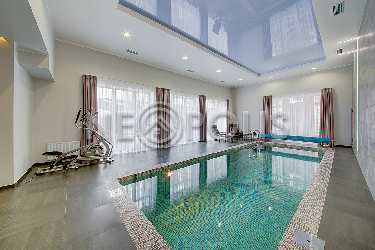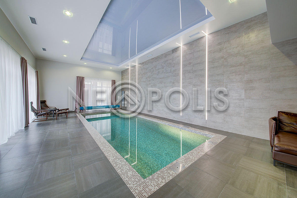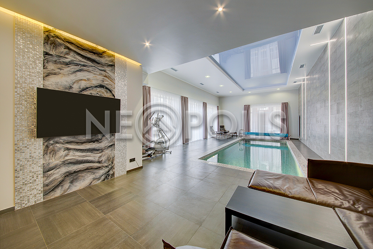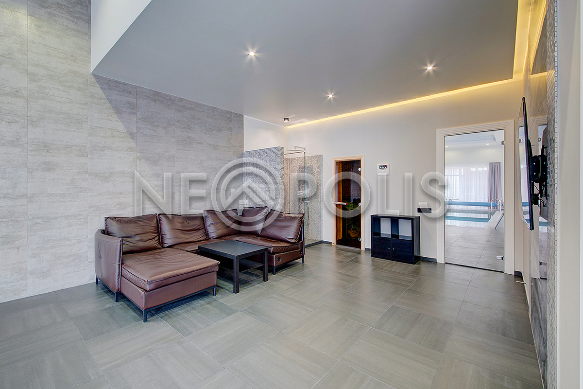 - 1 этаж:холл с зоной хранения, кухня-столовая, гостиная с камином, SPA зона: бассейн, сауна, тренажерный зал; санузел, бойлерная, гараж (48 кв.м.) на 2 авто, веранда под летнюю кухню.