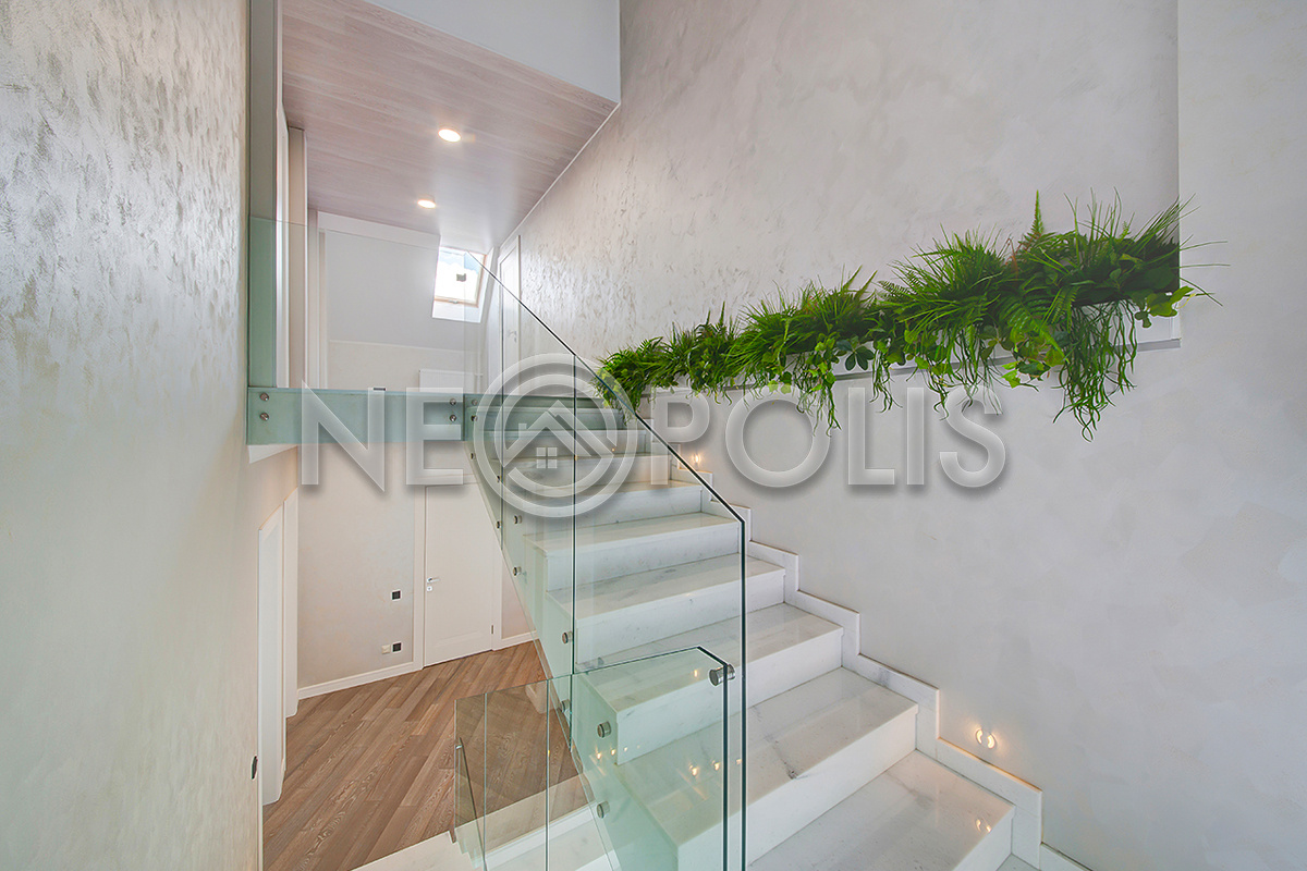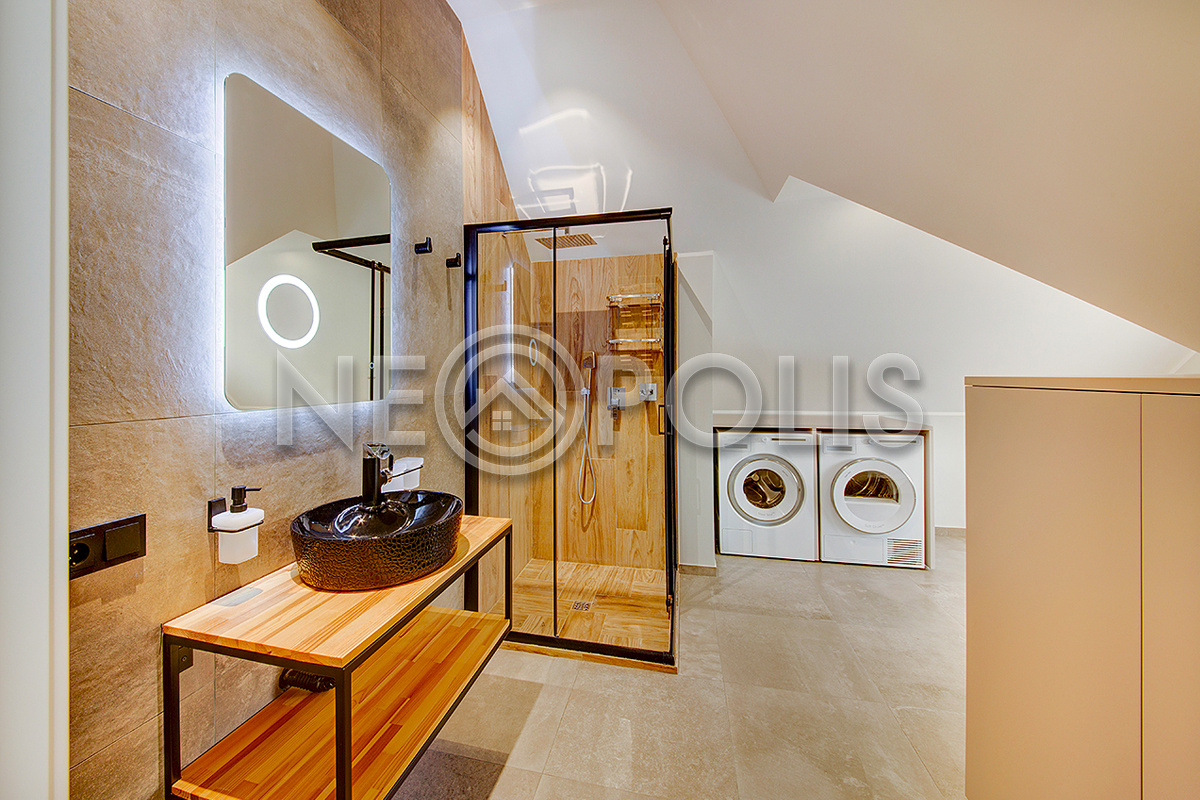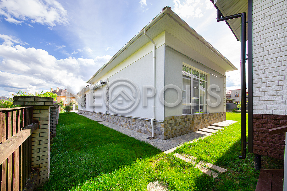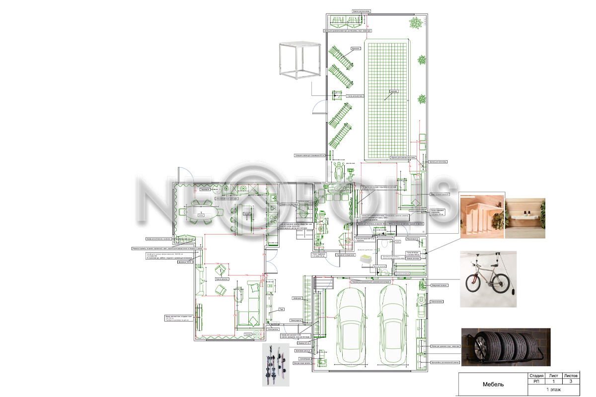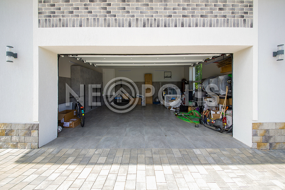 - 1 этаж:холл с зоной хранения, кухня-столовая, гостиная с камином, SPA зона: бассейн, сауна, тренажерный зал; санузел, бойлерная, гараж (48 кв.м.) на 2 авто, веранда под летнюю кухню.