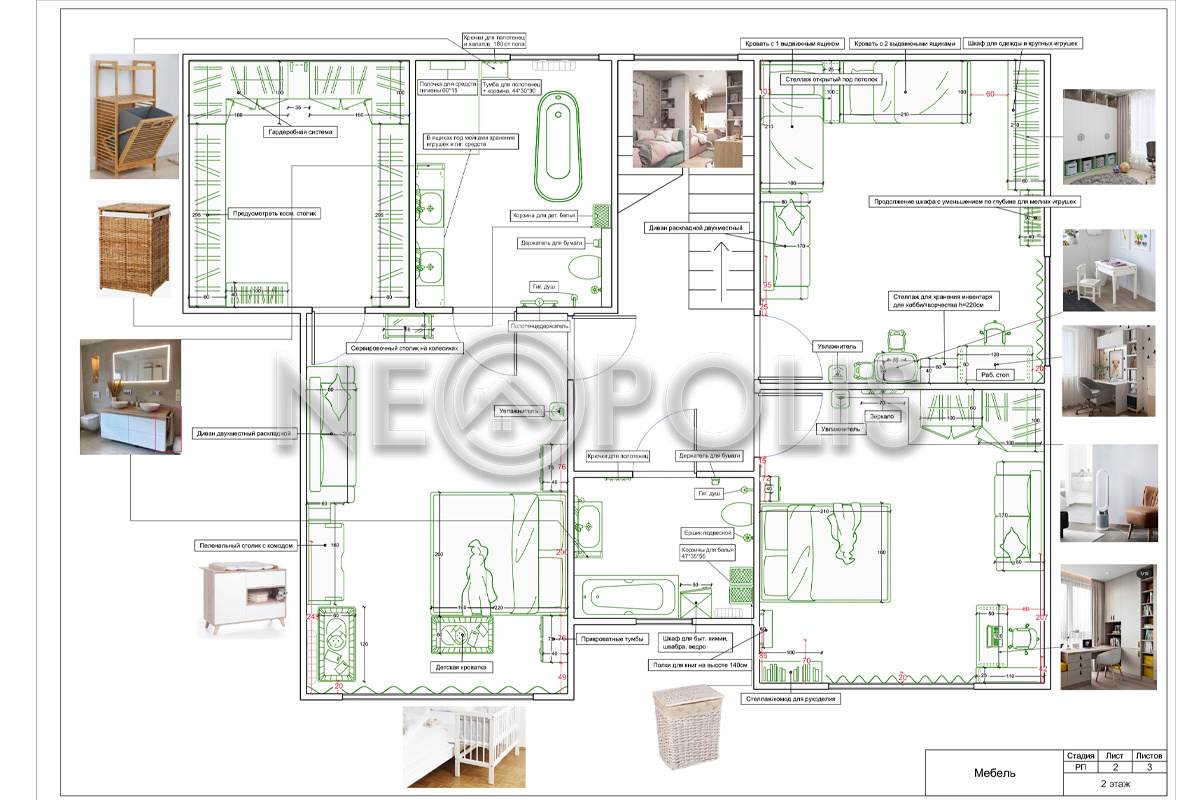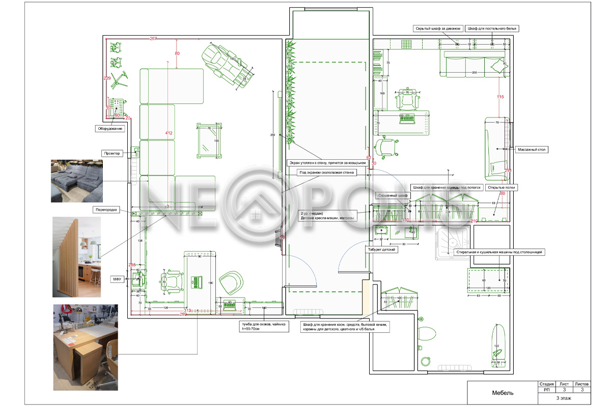 - 3 этаж:зона домашнего кинотеатра, кабинет, спальня, санузел, постирочная.