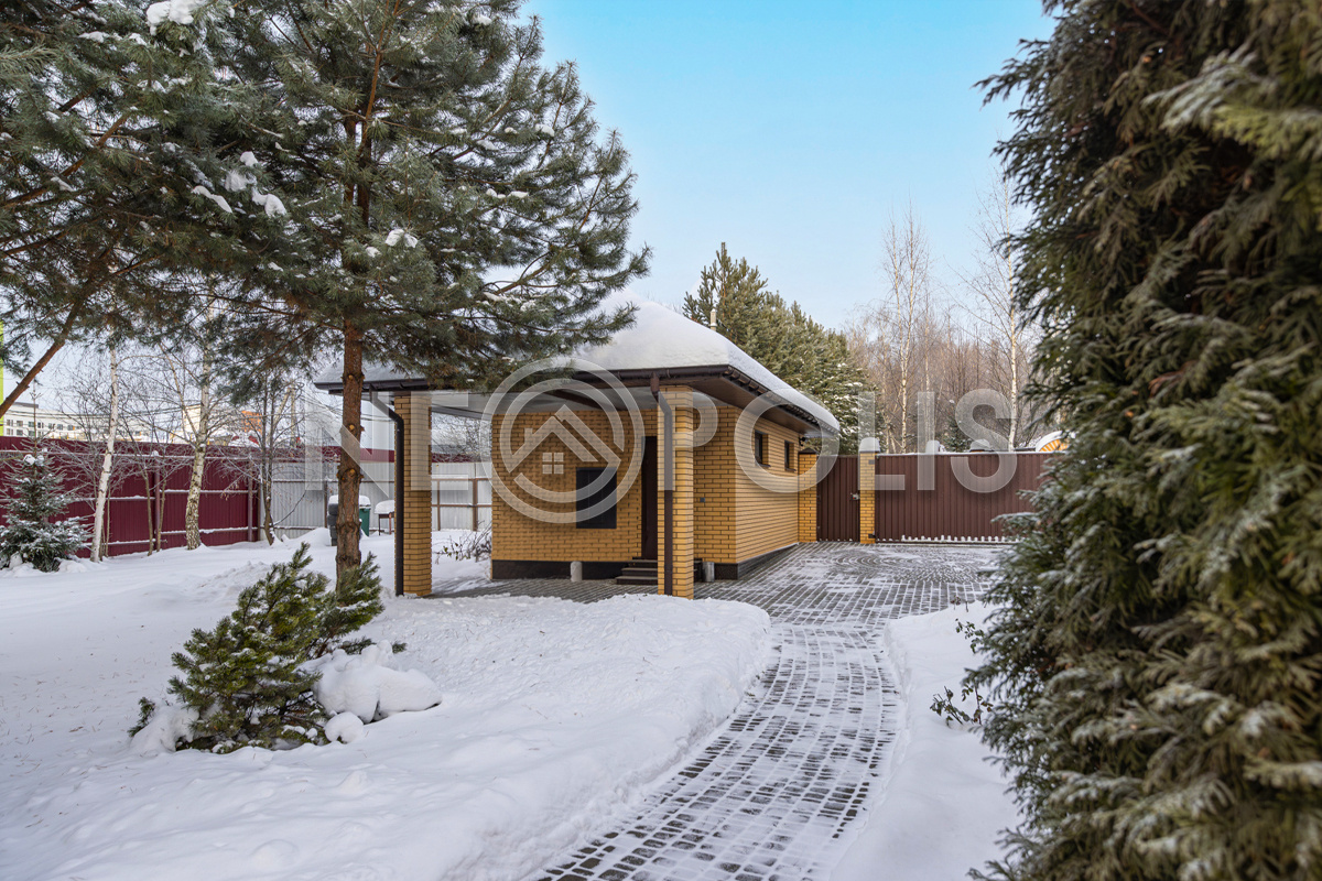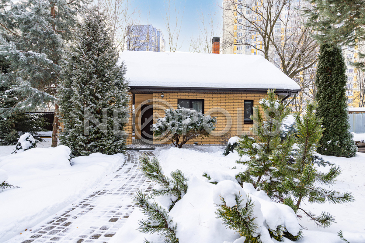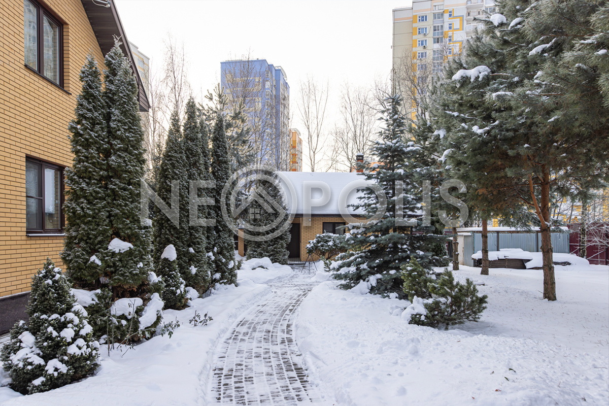 На участке выполнен ландшафтный дизайн с хвойными и лиственными деревьями. Дорожки вымощены брусчаткой.