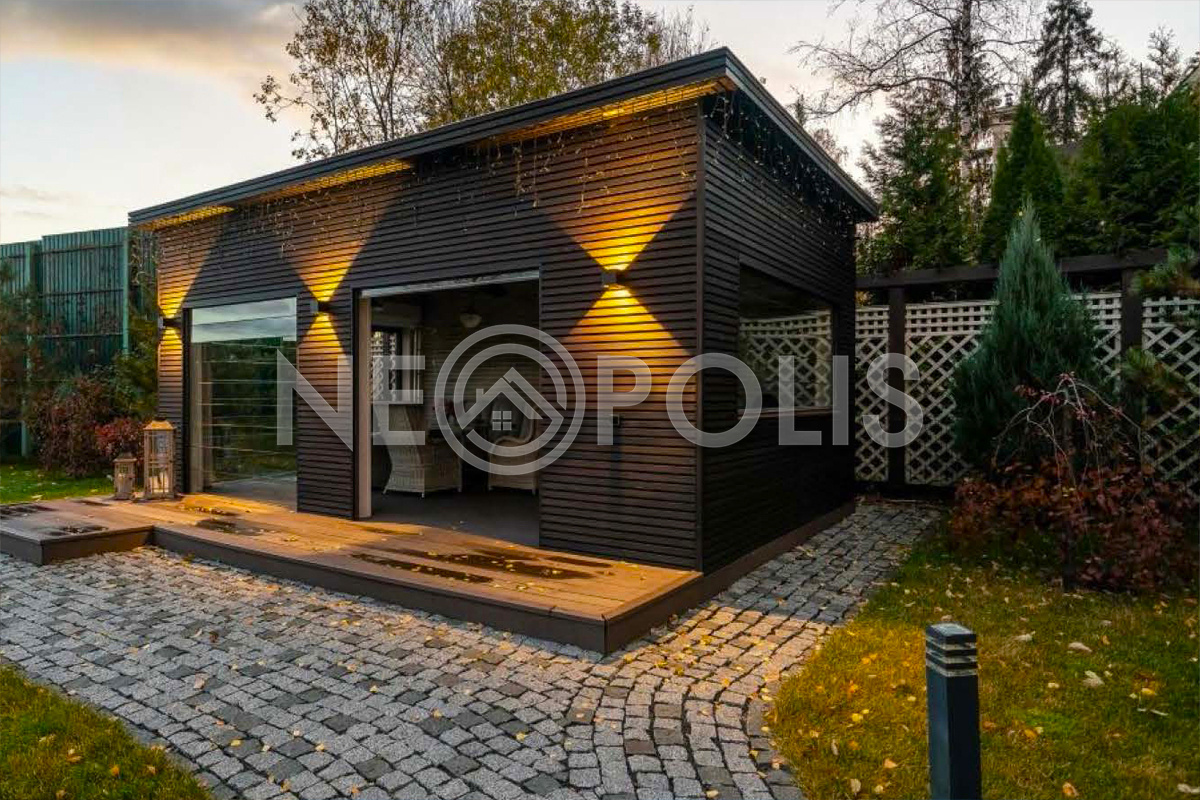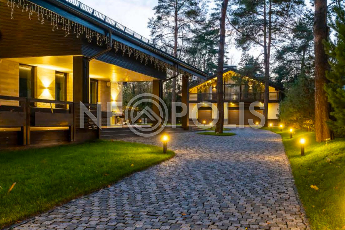Просторный участок с хвойными и лиственными деревьями, выполнен дренаж, смонтировано уличное освещение, установлена система автоматического полива.