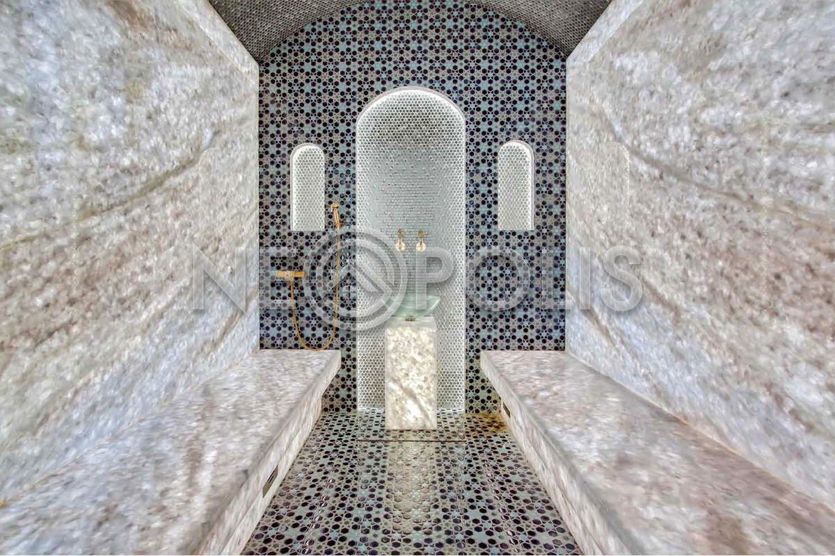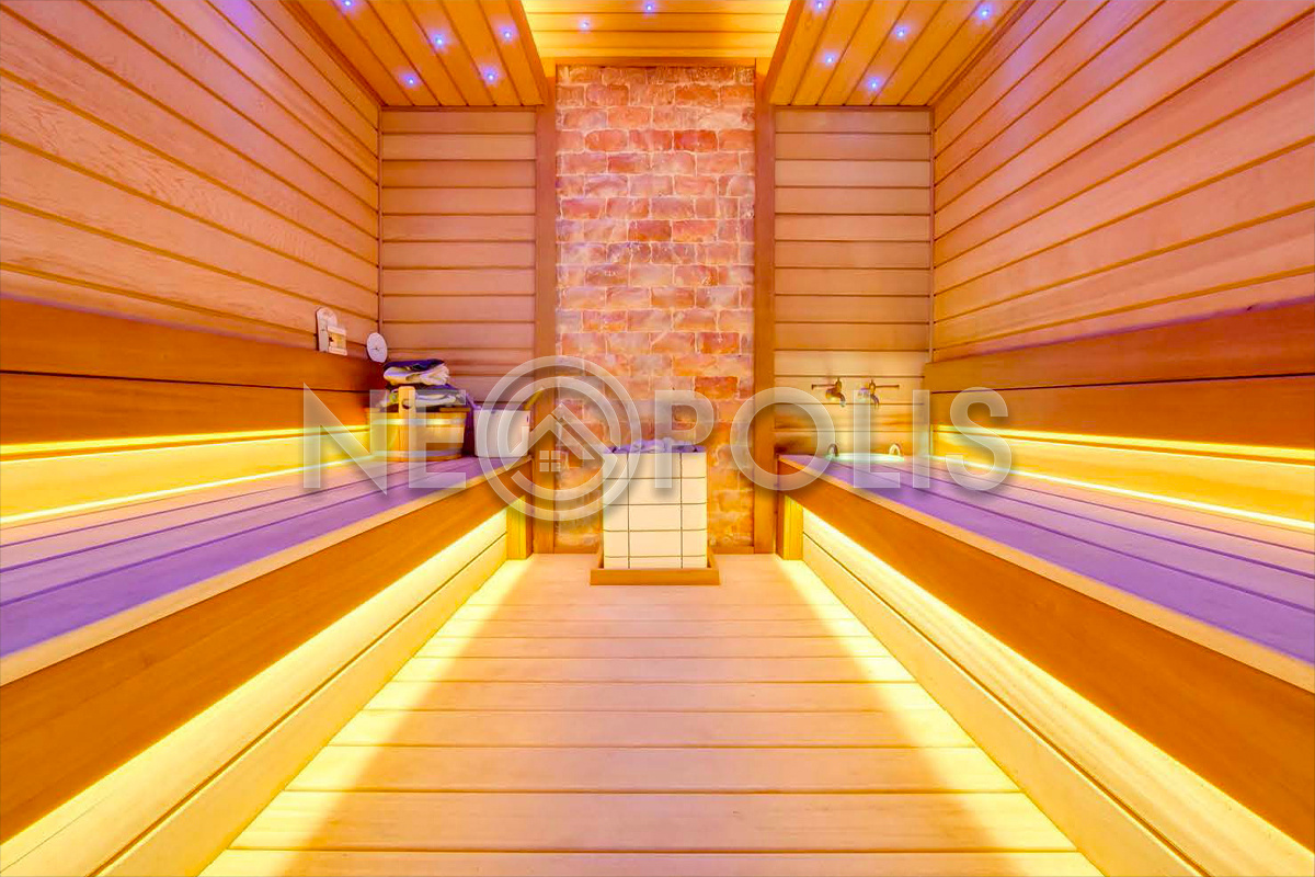 - 1 этаж:холл с гардеробной, кухня с кладовой и выходами на террасу, столовая, гостиная со вторым светом, мастер-спальня с гардеробной и ванной комнатой, гостевая спальня, 2 санузла, SPA зона: бассейн, сауна, хамам, санузел, тренажерный зал, вспомогательные технические и хозяйственные помещения.