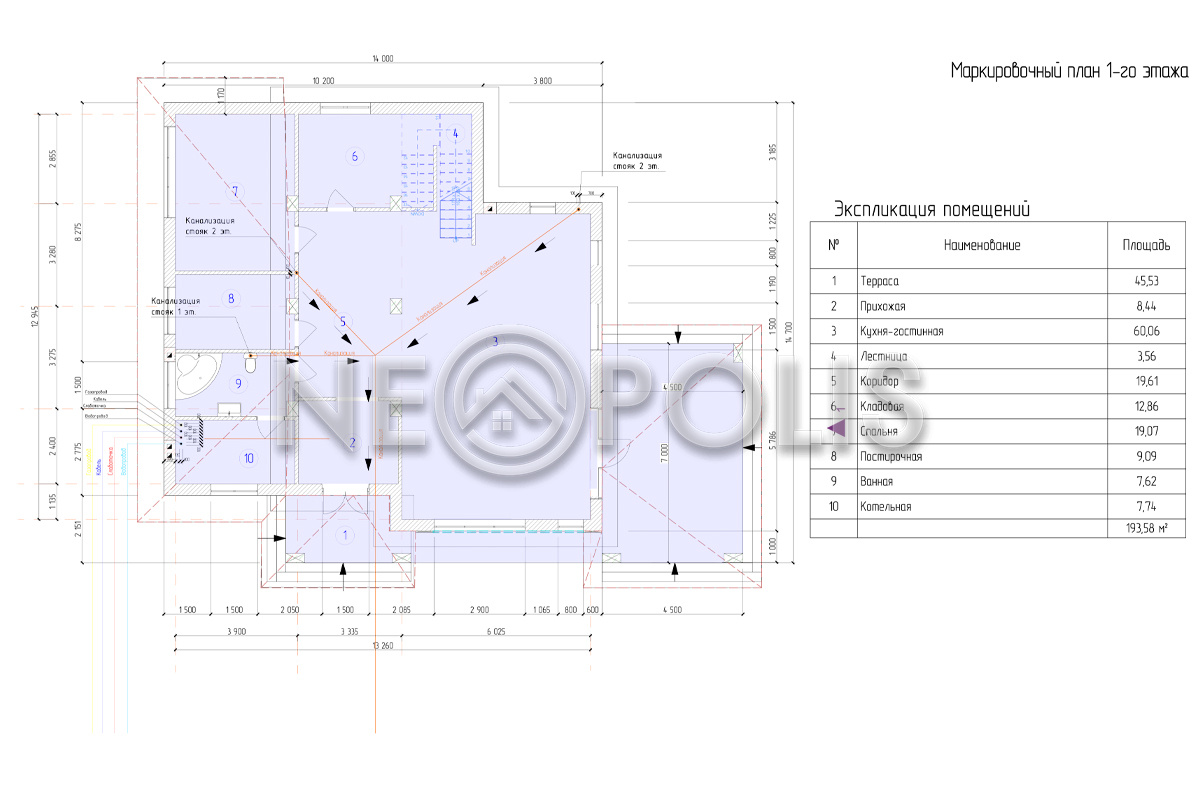 - 1 этаж:терраса, прихожая, кухня-столовая, гостиная с выходом на террасу, спальня, санузел, постирочная, кладовая, котельная.