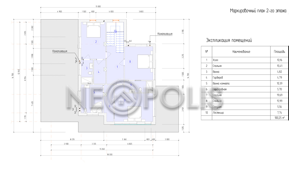 - 2 этаж:холл, мастер-спальня с гардеробной и ванной комнатой, спальня с гардеробной и ванной комнатой, спальня с ванной комнатой.