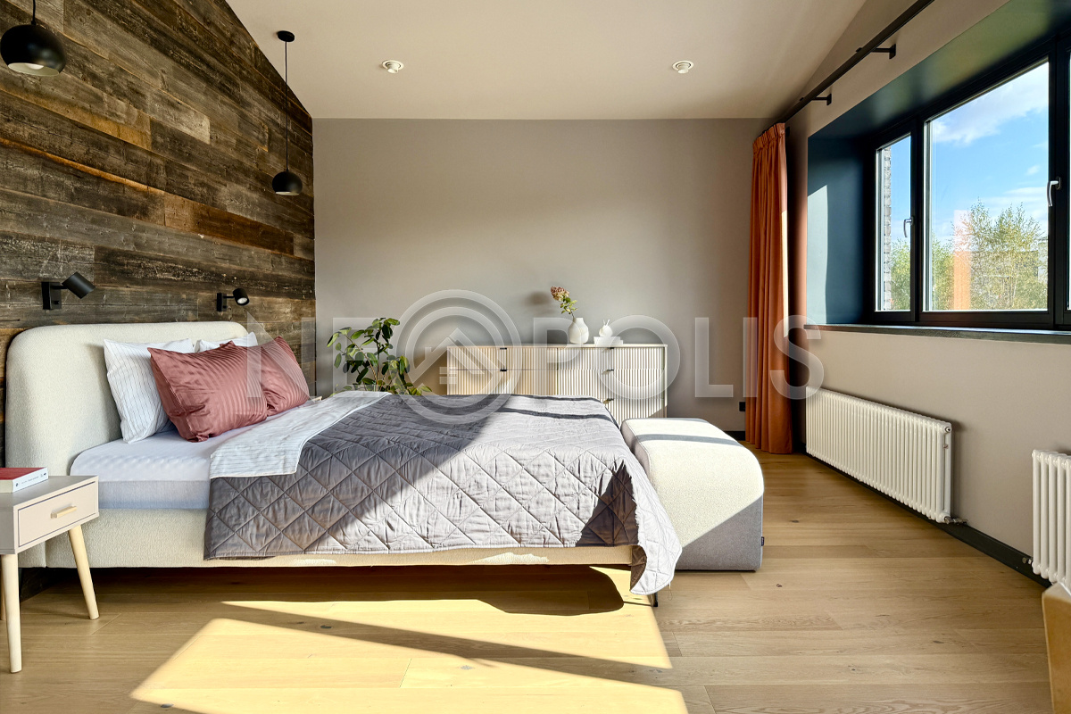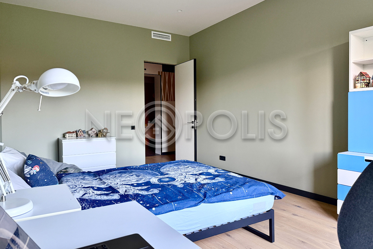 - 2 этаж:холл, мастер-спальня с гардеробной и ванной комнатой, три спальни с гардеробными, спальня, кабинет с балконом, два санузла, постирочная, серверная.