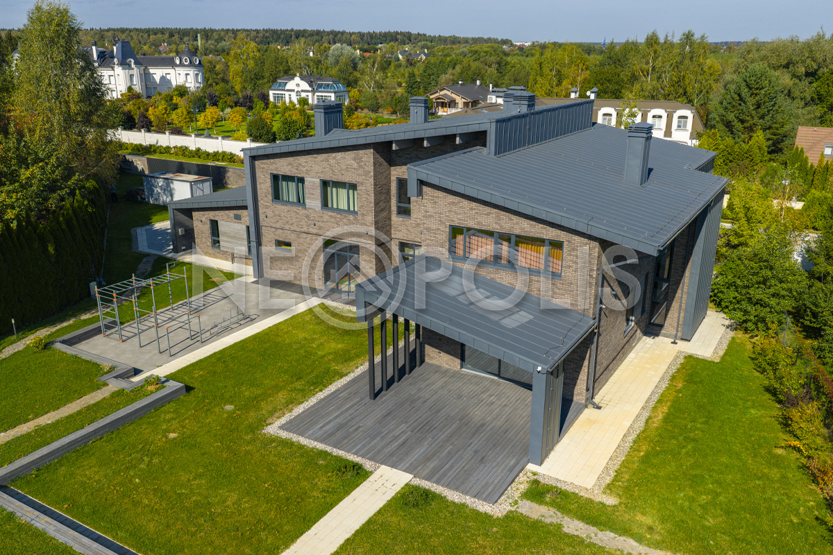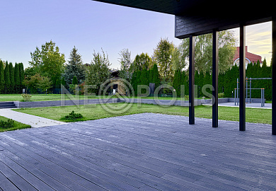 - 1 этаж:прихожая с гардеробной и кладовой, холл, кухня-столовая с выходом на террасу, гостиная, зона домашнего кинотеатра, игровая, тренажерный зал с выходом на задний двор, сауна с санузлом и душевой, кладовая, санузел, гараж с котельной и техническим помещением и отдельным входом с улицы.
