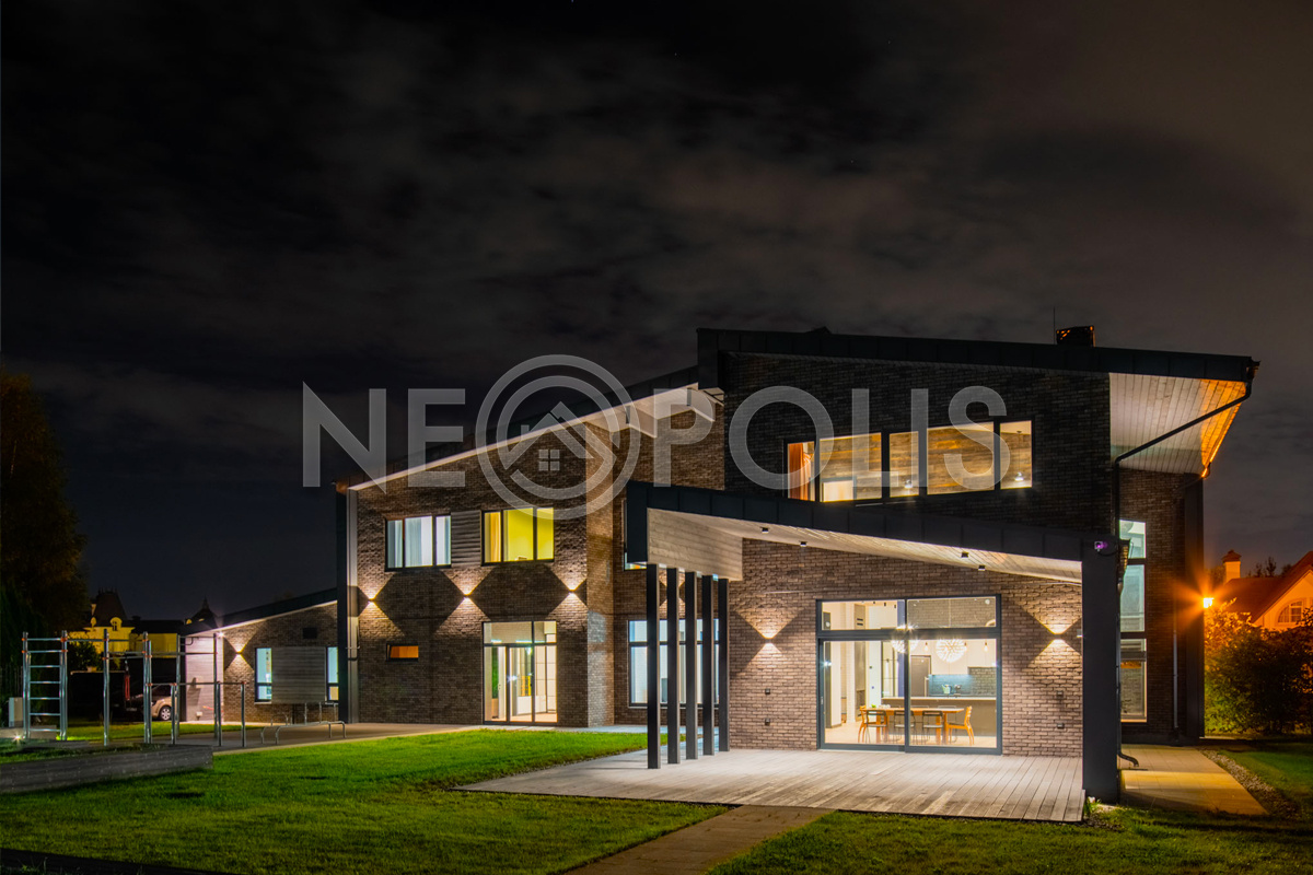 - Материал стен фасад облицован бельгийским кирпичом и декорирован подсветкой